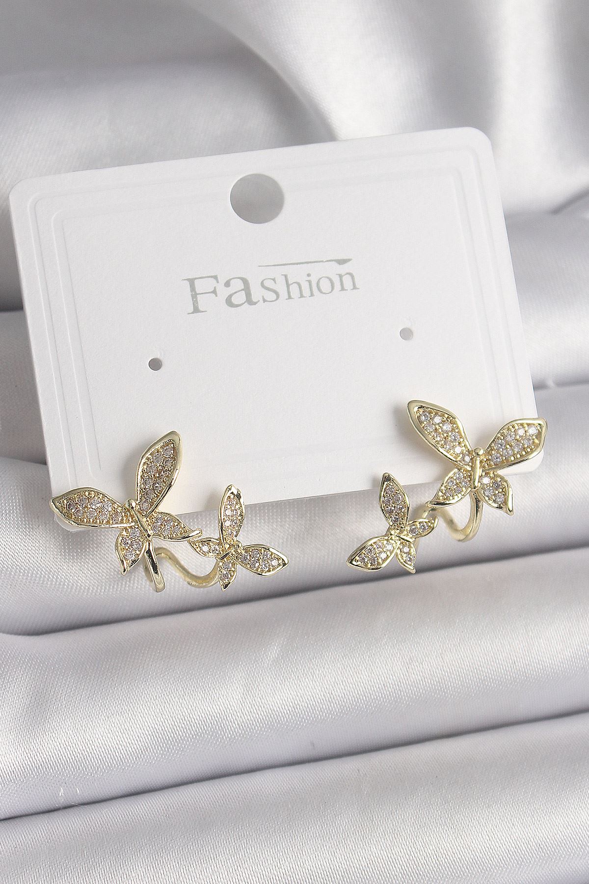 Pirinç Gold Renk Zirkon Taşlı Kelebek Model Kadın Küpe - TJ-BKP9838