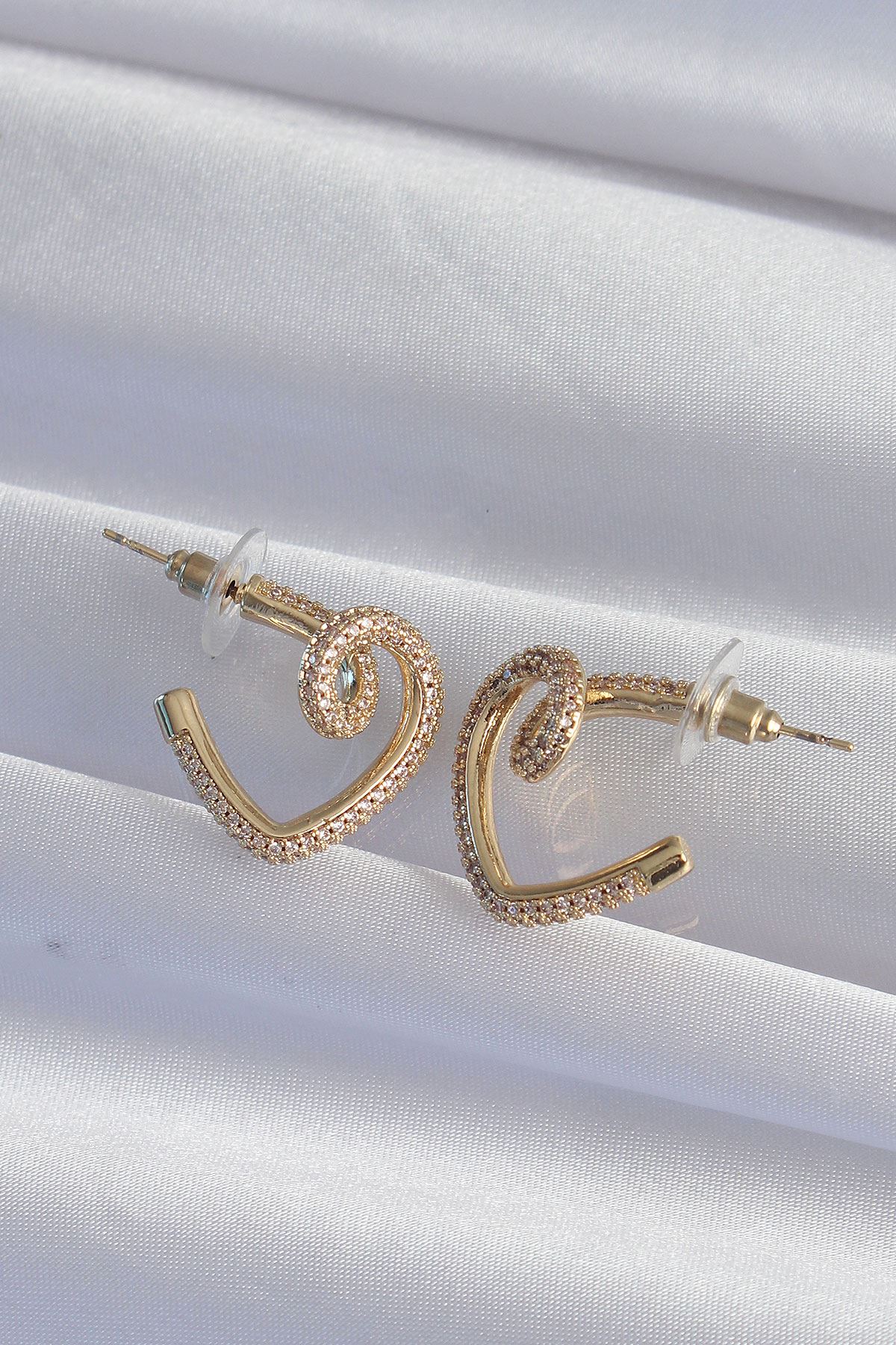 Pirinç Gold Renk Zirkon Taşlı Kıvrımlı Yarım Kalp Küpe - TJ-BKP9279