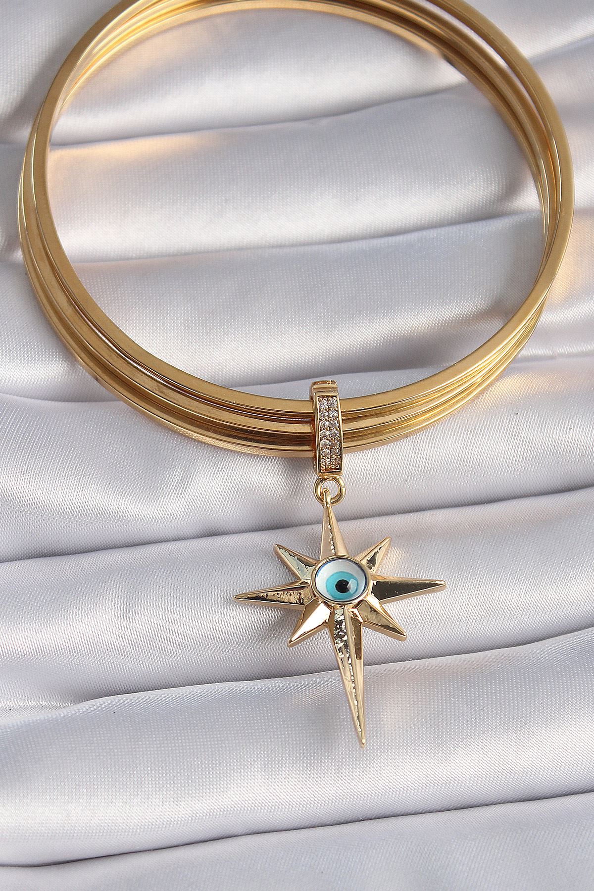 Pirinç Gold Renk Zirkon Taşlı Kutup Yıldızı Nazar Boncuk Detay Ajda Charm - TJ-BC1006