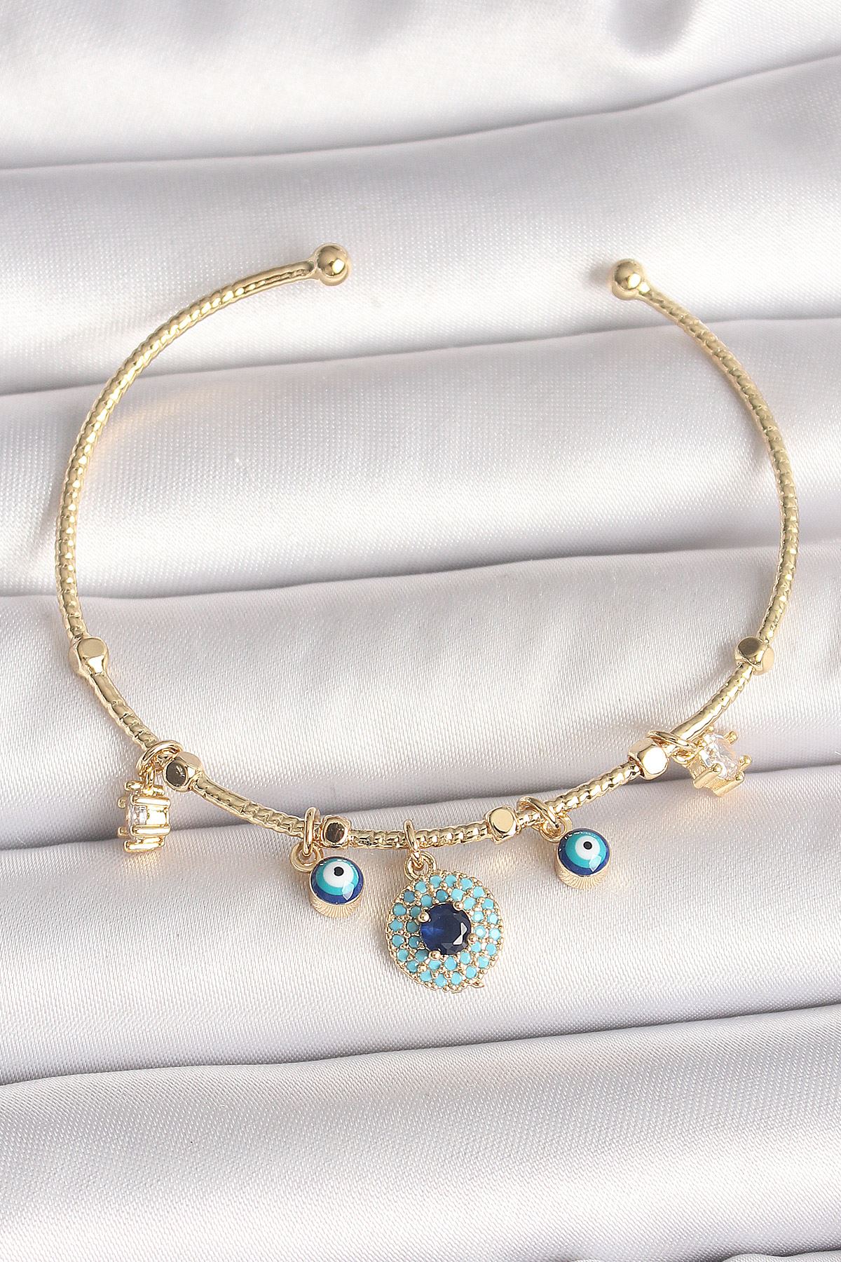 Pirinç Gold Renk Zirkon Taşlı Nazar Boncuk Detay Charm Kadın Bileklik - TJ-BB6883