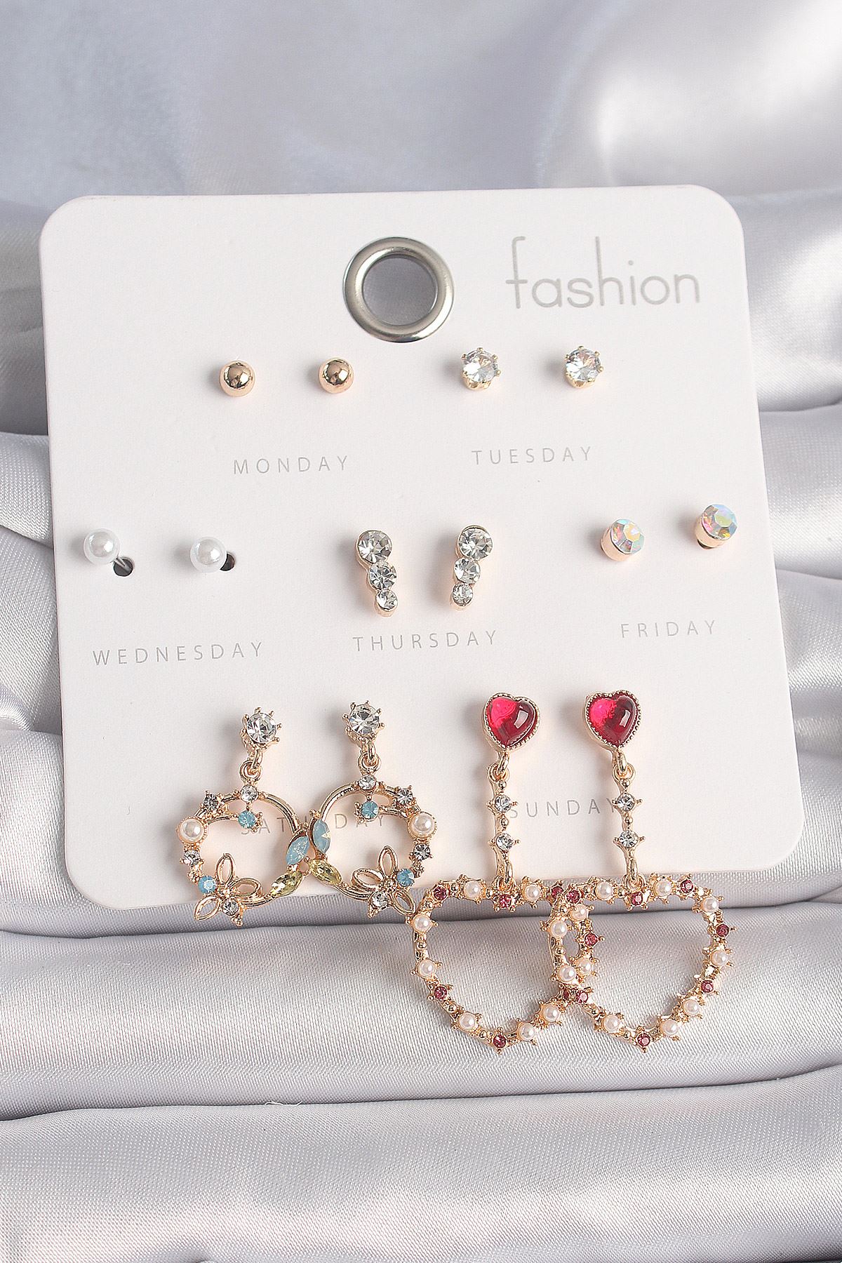 Pirinç Gold Renk Zirkon Taşlı Sallantı Kalp Figür 7 Çift Kadın Küpe Seti - TJ-BKP10163