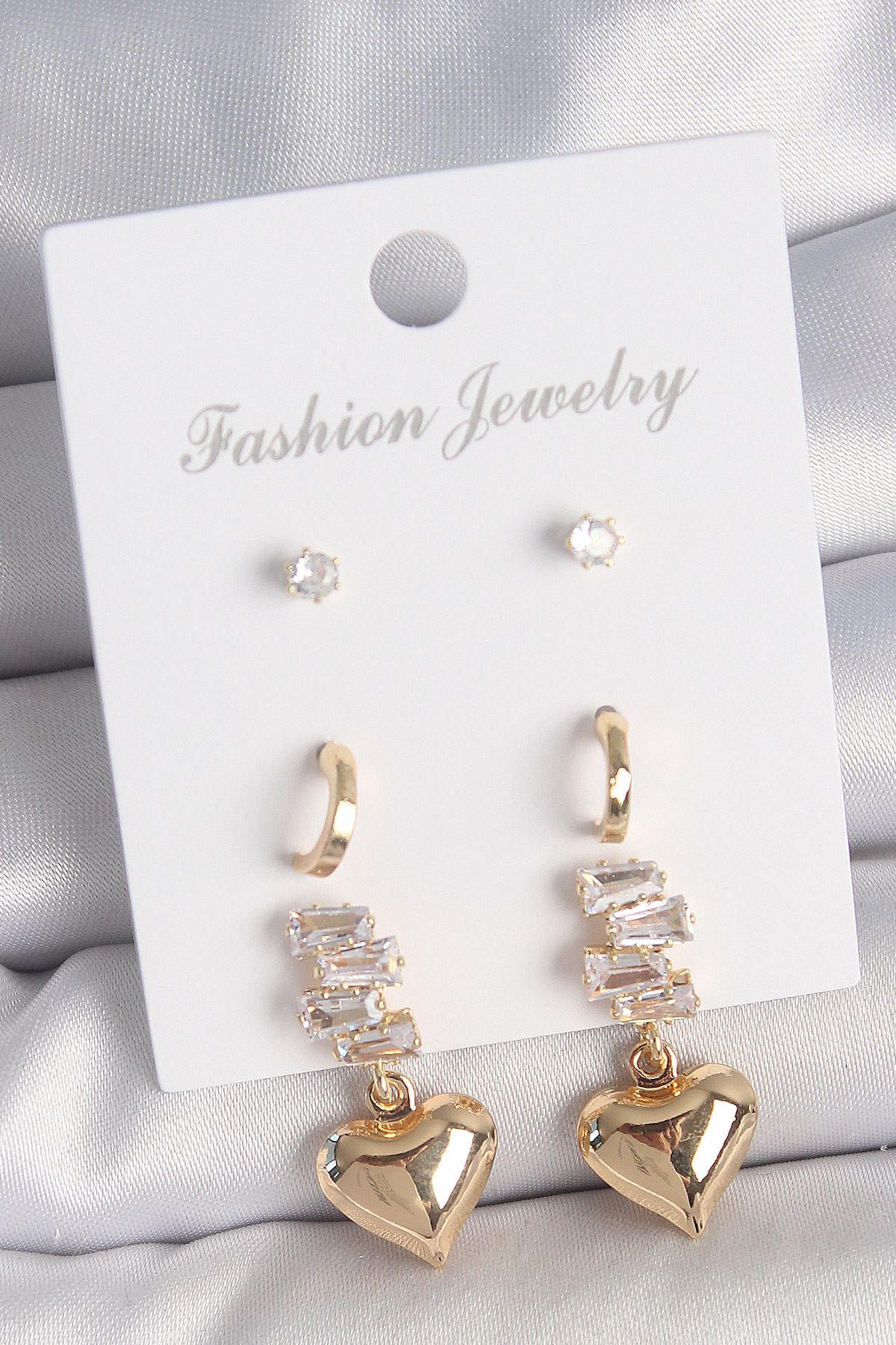 Pirinç Gold Renk Zirkon Taşlı Sallantılı Kalp Model Yarım Halka Detay 3 Çift Kadın Küpe Seti - TJ-BKP10612