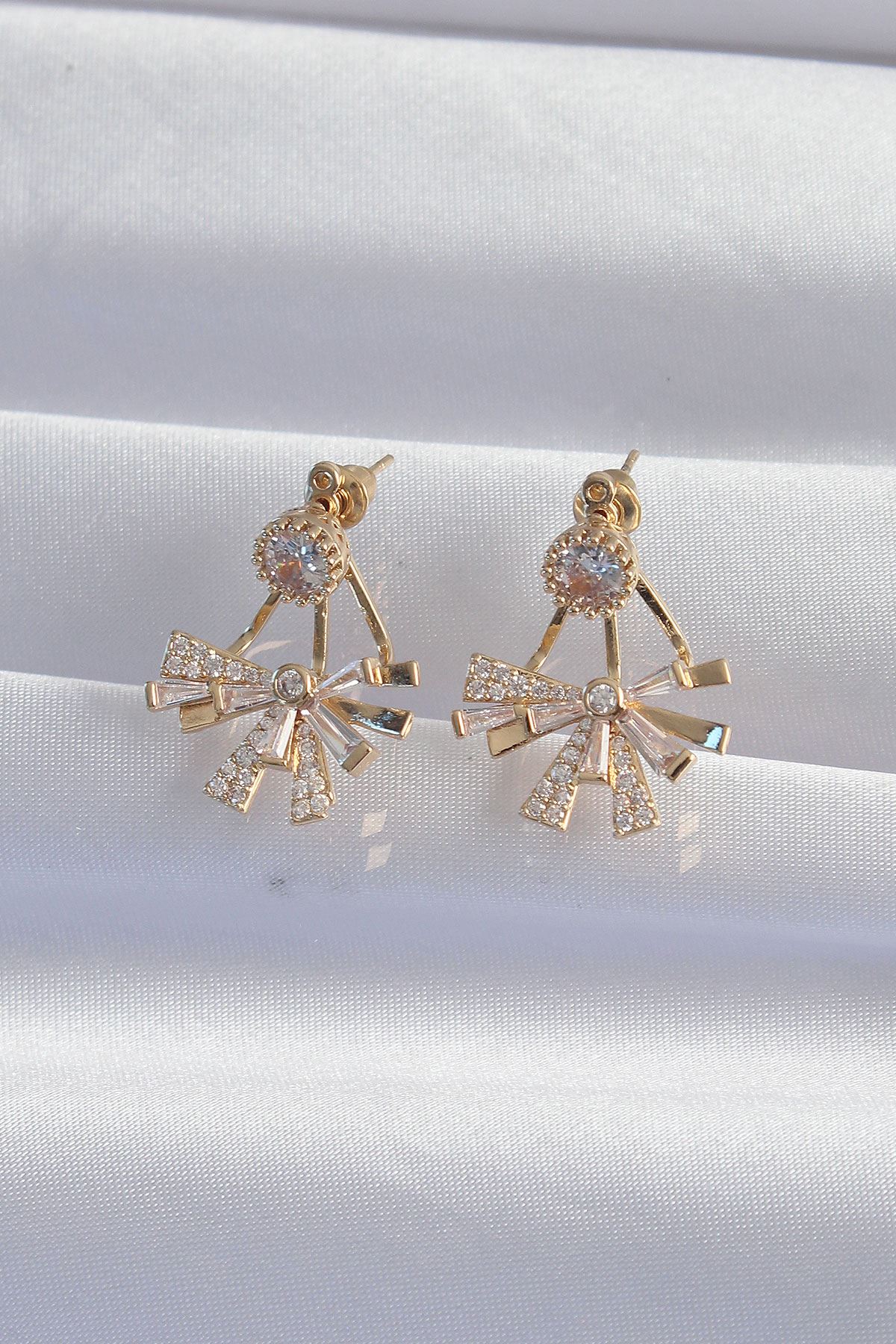 Pirinç Gold Renk Zirkon Taşlı Yassı Fiyonk Model Küpe - TJ-BKP9301