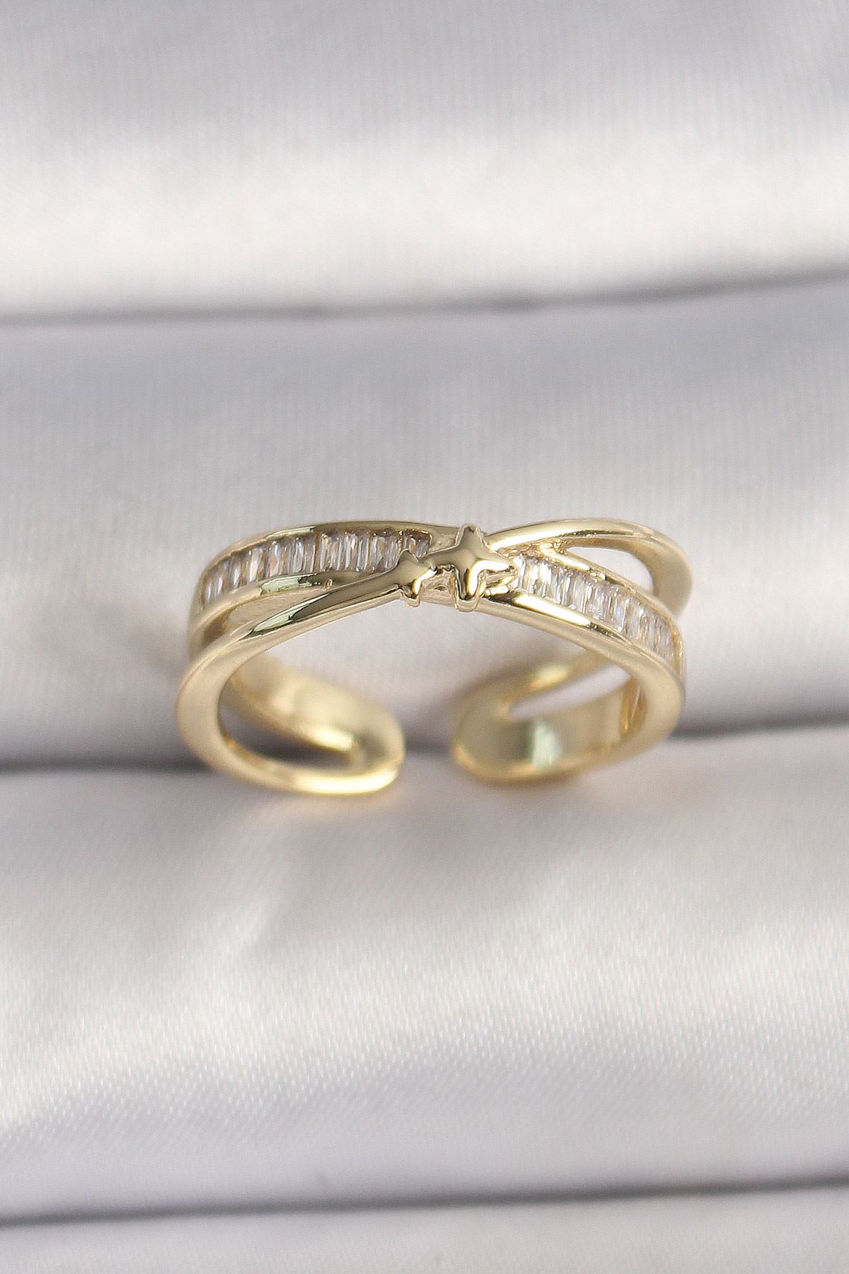 Pirinç Gold Renk Zirkon Taşlı Yıldız Detaylı Ayarlanabilir Kadın Yüzük - TJ-BYK3573