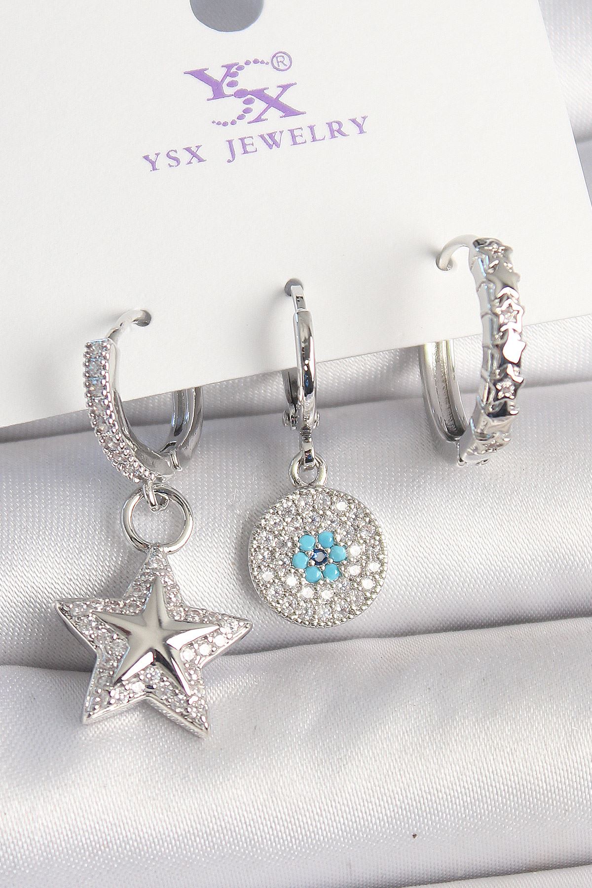 Pirinç Gold Renk Zirkon Taşlı Yıldız Model Nazar Boncuk Detay 3'Lü Kadın Kombin Küpe - TJ-BKP10446