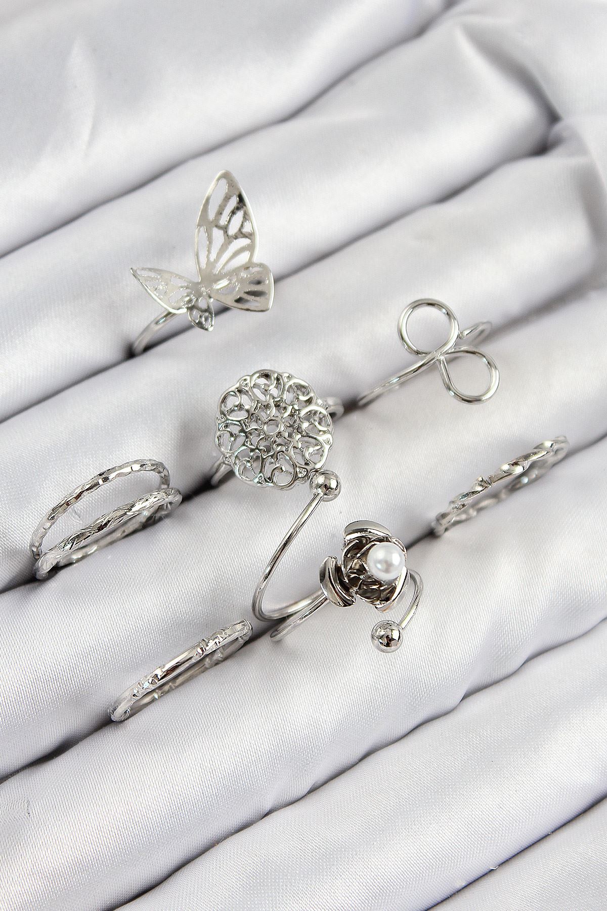 Pirinç Gül Kelebek Model Gümüş Renk Kadın Yüzük Kombin Set - TJ-BYK3810