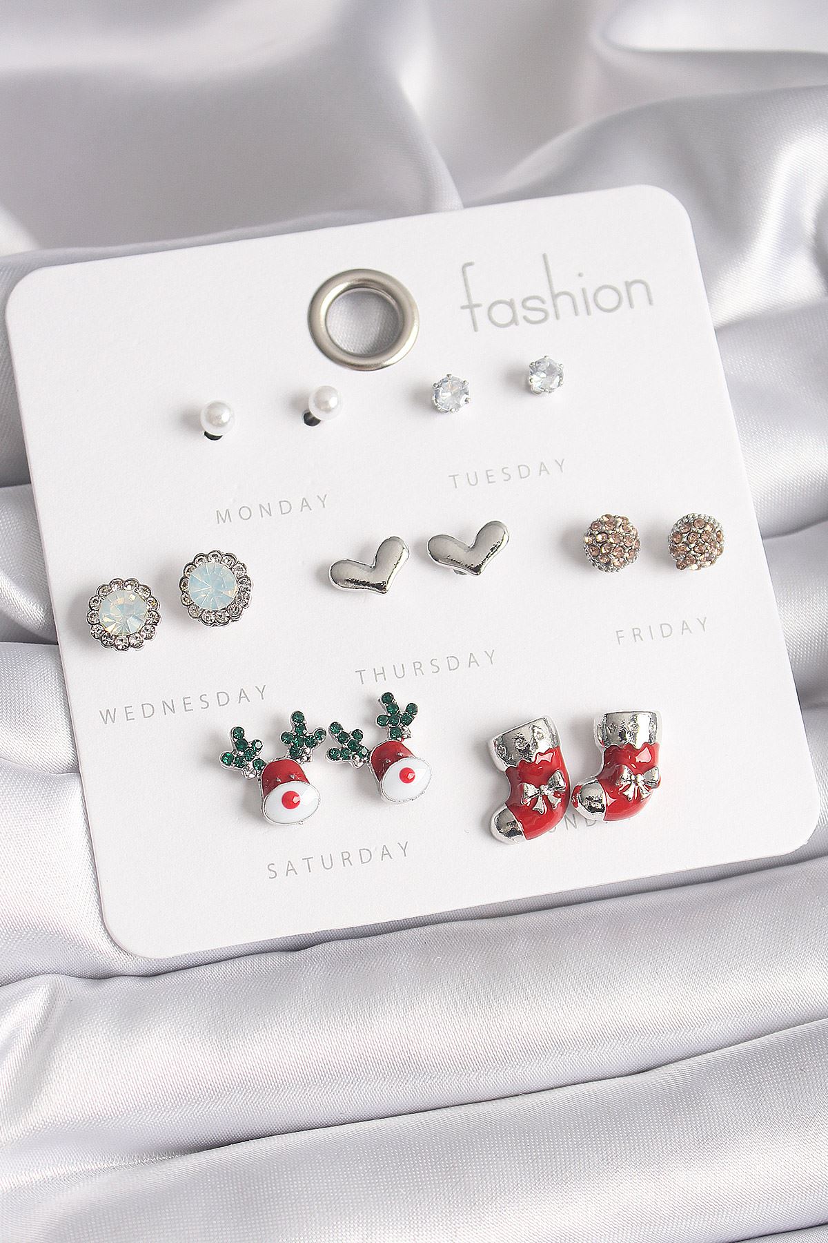 Pirinç Gümüş Renk 7 Çift Zirkon Taşlı Yıl Başı Temalı Kadın Küpe Seti - TJ-BKP9715