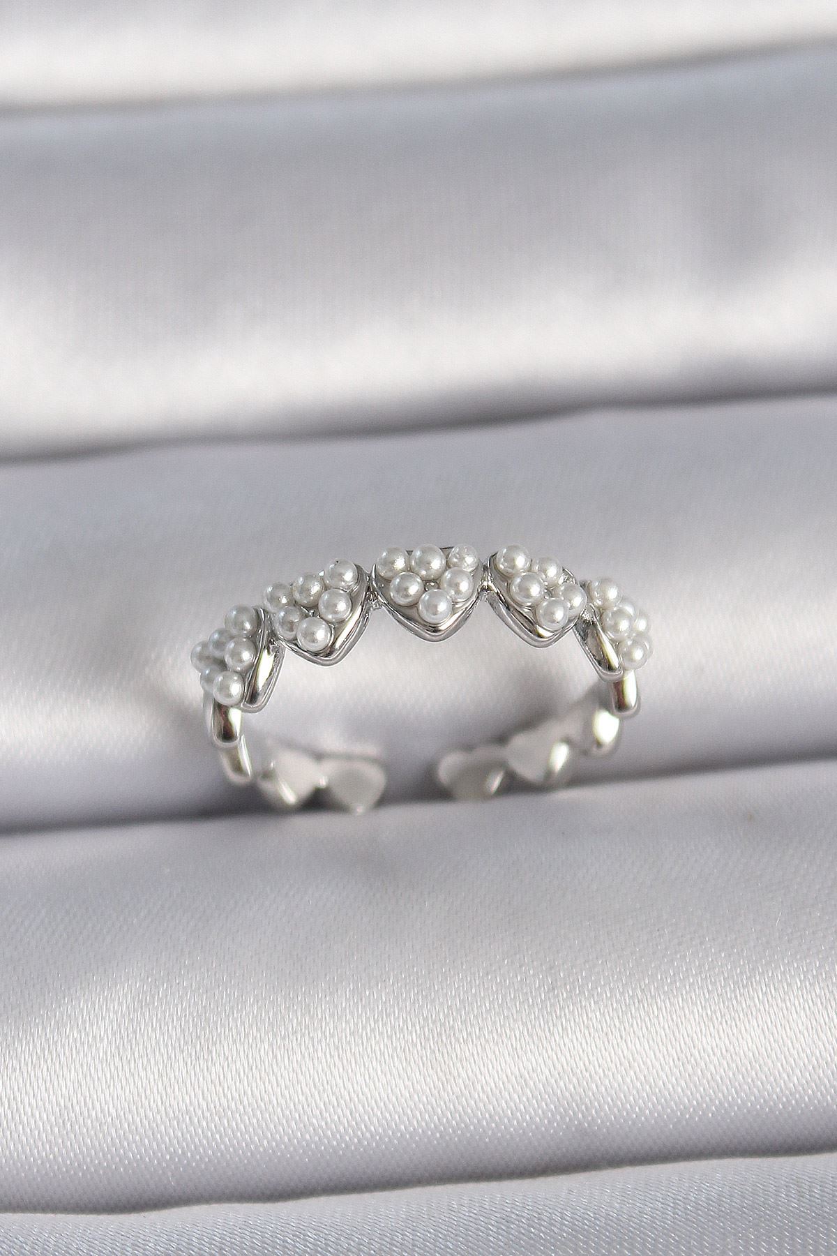 Pirinç Gümüş Renk Ayarlanabilir İncili Kalp Model Kadın Yüzük - TJ-BYK3411
