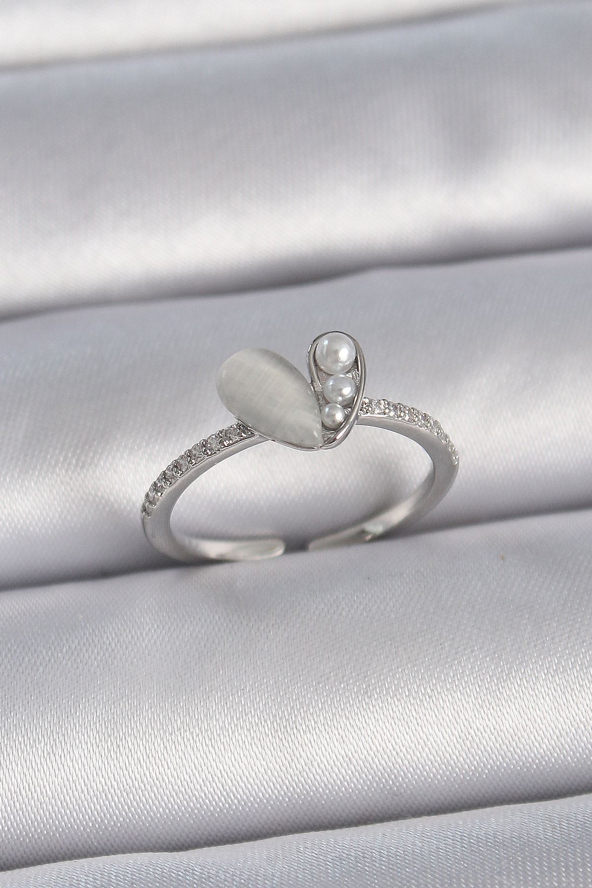 Pirinç Gümüş Renk Ayarlanabilir Zirkon Taşlı İncili Beyaz Mineli Kalp Model Kadın Yüzük - TJ-BYK3377