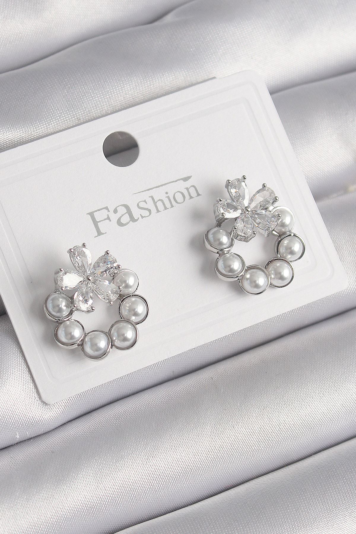 Pirinç Gümüş Renk İncili Halka Model Zirkon Taşlı Çiçek Detay Kadın Küpe - TJ-BKP9998