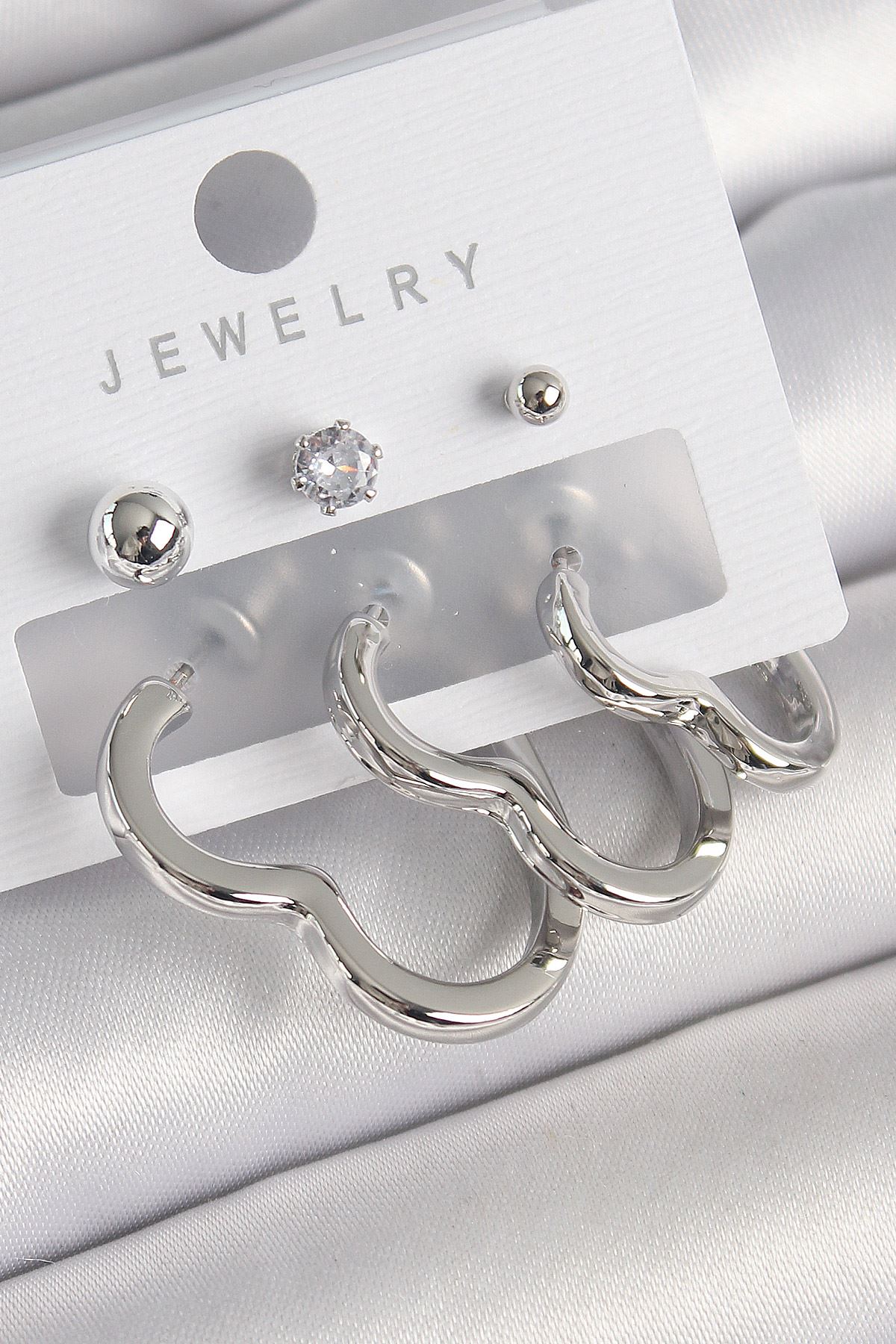 Pirinç Gümüş Renk Kalp Model Zirkon Taş Topçuk Detay Kadın Küpe Seti - TJ-BKP10307
