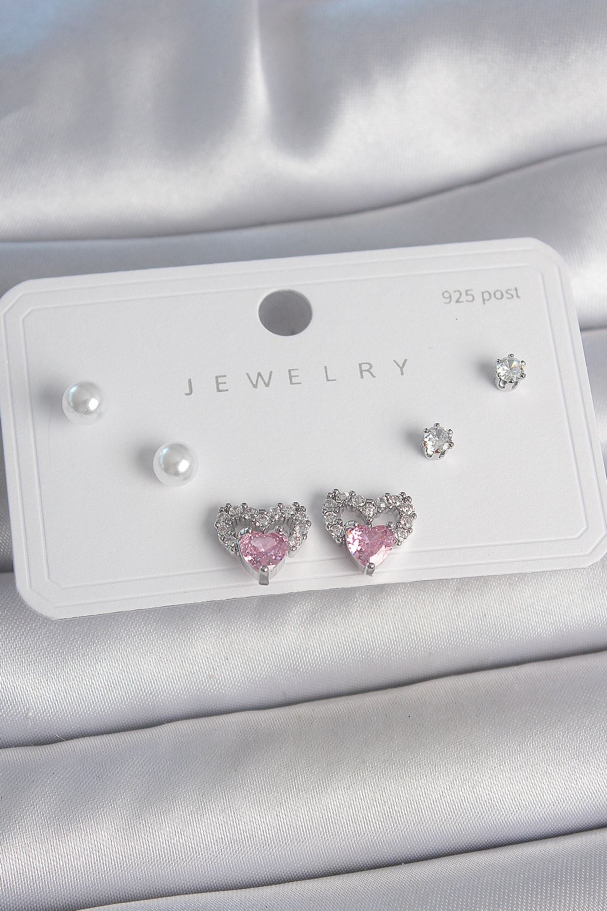 Pirinç Gümüş Renk Pembe Zirkon Taşlı Kalp Model İnci Detay 925 Ayar Gümüş Çivi Kadın Küpe Seti - TJ-BKP10489