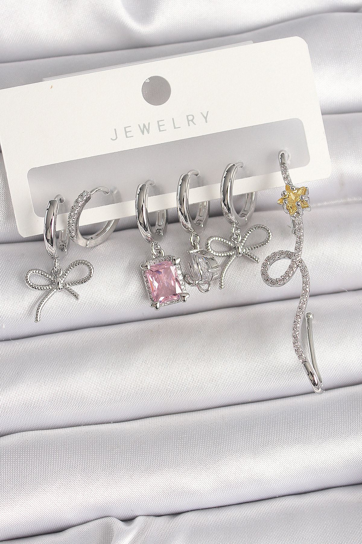 Pirinç Gümüş Renk Sallantı Kurdele Kuyruklu Yıldız Figür Pembe Kare Zirkon Taş Detay Kadın Küpe Seti - TJ-BKP10368