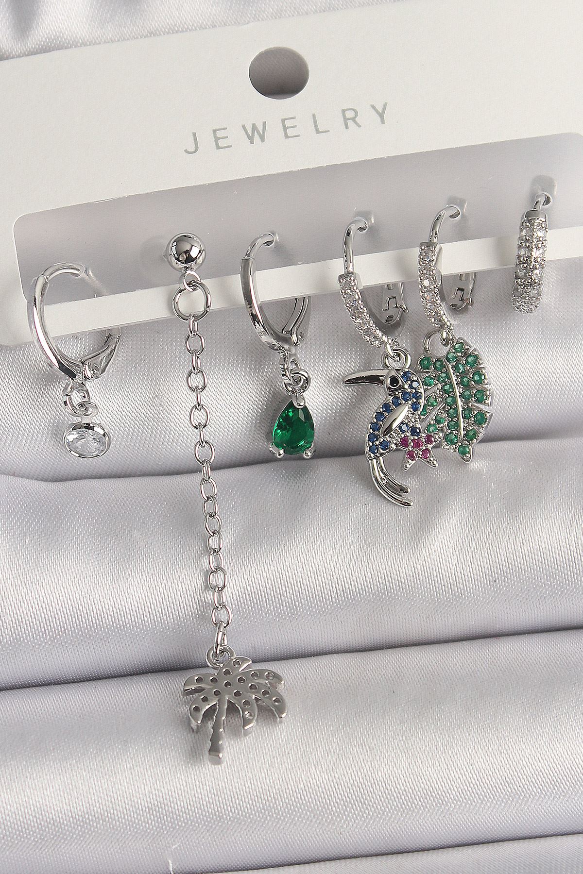Pirinç Gümüş Renk Sallantı Zirkon Taşlı Ağaç Figür Çoklu Kadın Küpe Seti - TJ-BKP10119