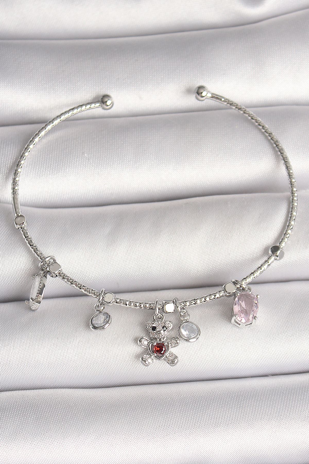 Pirinç Gümüş Renk Sallantı Zirkon Taşlı Ayıcık Figür Kırmızı Taş Detay Charm Kadın Bileklik - TJ-BB6912