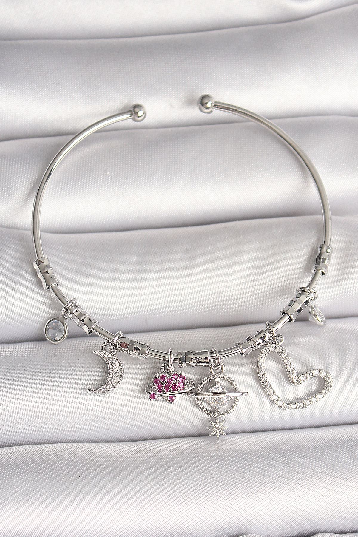 Pirinç Gümüş Renk Sallantı Zirkon Taşlı Gezegen Figür Kalp Detay Charm Kadın Bileklik - TJ-BB6899