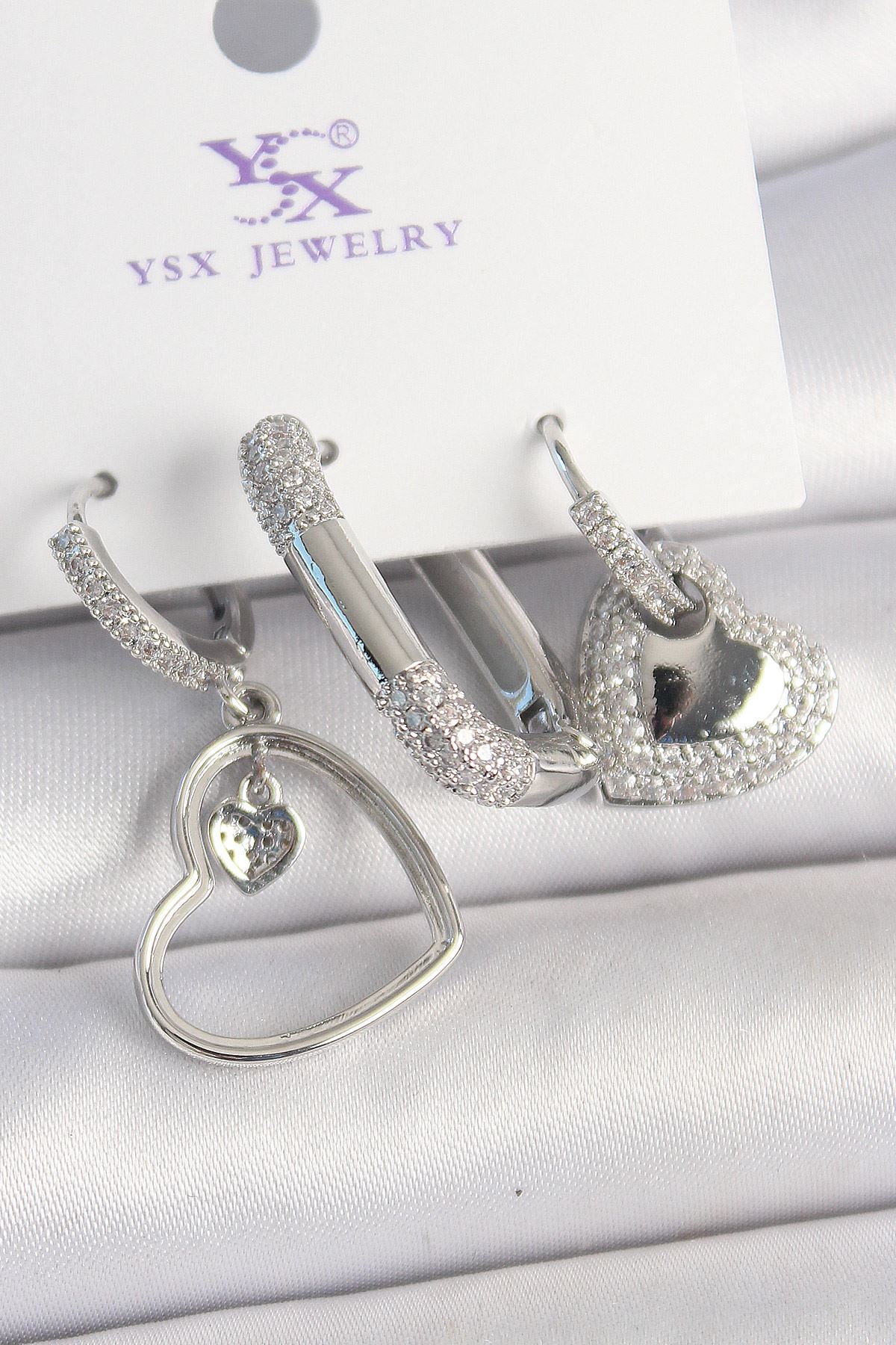 Pirinç Gümüş Renk Sallantı Zirkon Taşlı Kalp Model 3'Lü Kadın Kombin Küpe - TJ-BKP10442