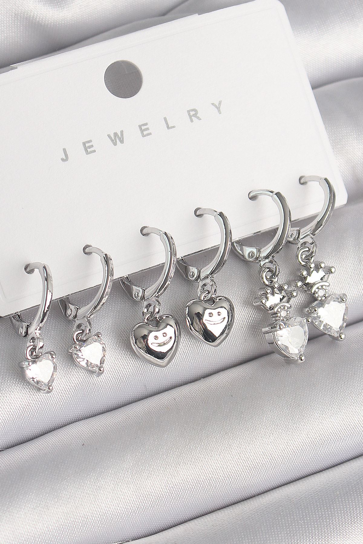 Pirinç Gümüş Renk Sallantı Zirkon Taşlı Kalp Model Taç Detay Kadın Küpe Seti - TJ-BKP10275
