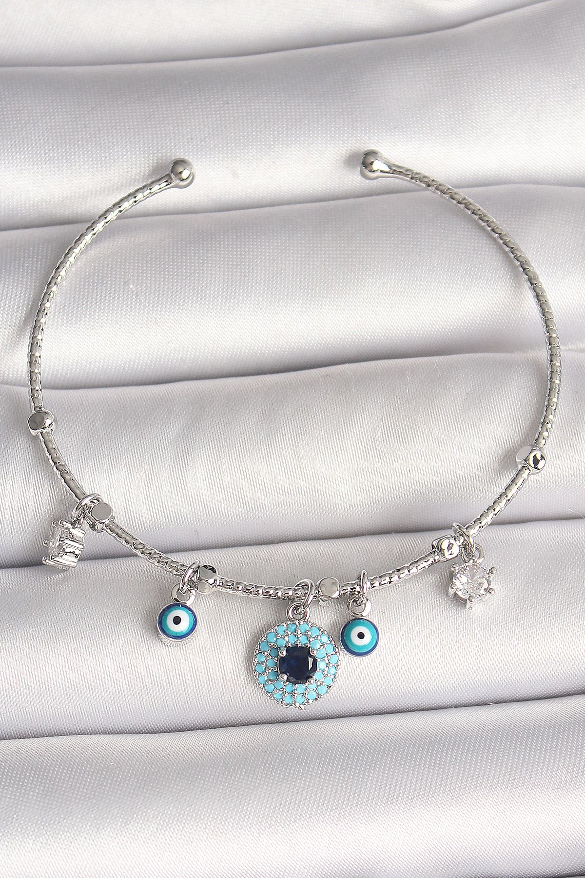 Pirinç Gümüş Renk Sallantı Zirkon Taşlı Nazar Boncuk Figür Charm Kadın Bileklik - TJ-BB6911