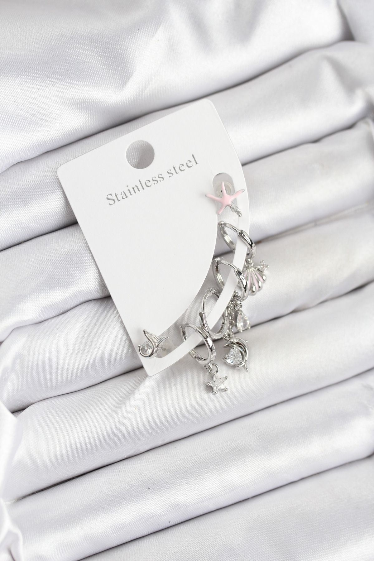 Pirinç Zirkon Taşlı Kutup Yıldızı Model Gümüş Renk 925 Ayar Gümüş Çivi Kadın Küpe Set - TJ-BKP11167