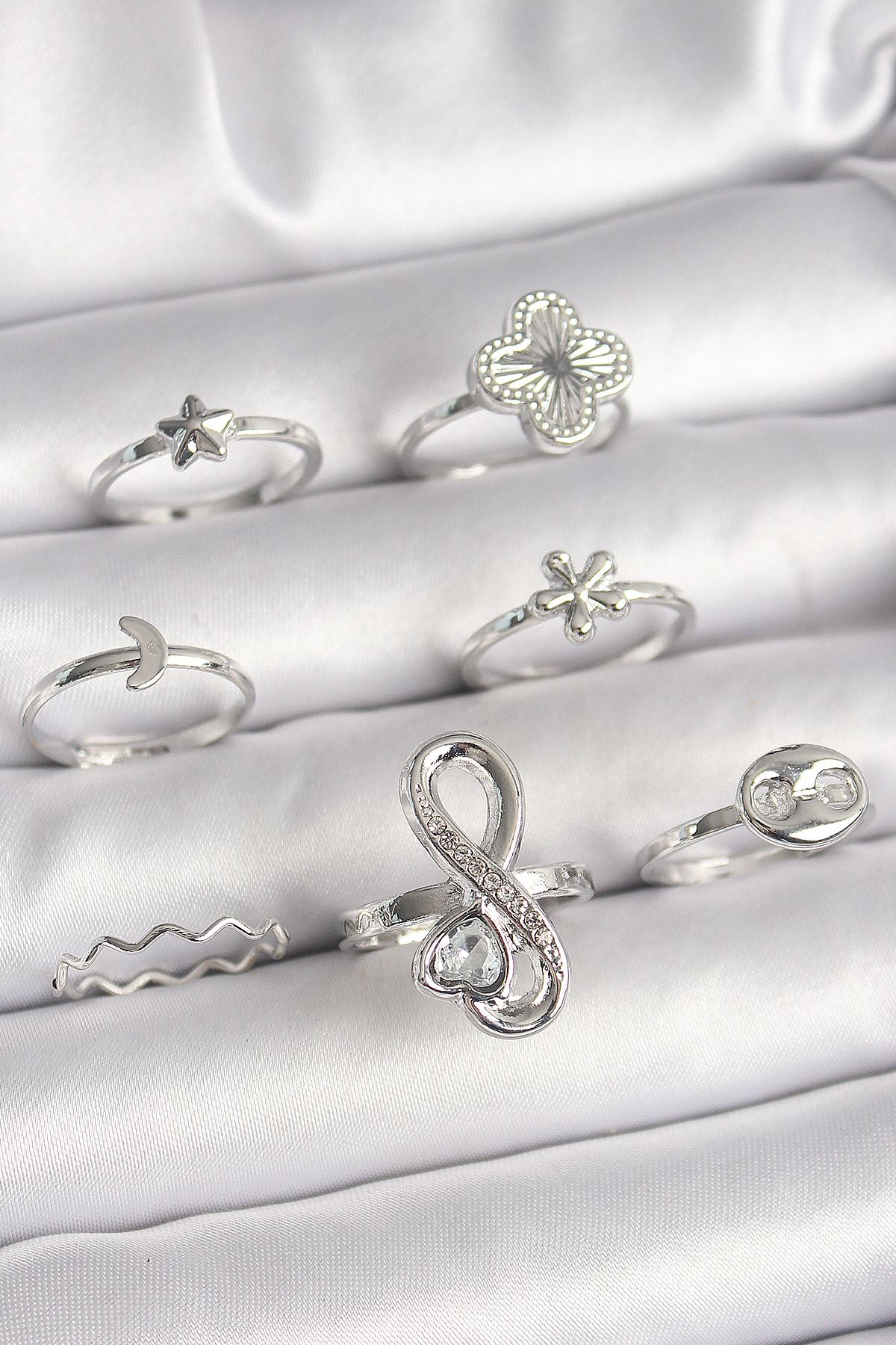 Pirinç Gümüş Renk Yonca Figür Sonsuzluk Zirkon Taşlı Kalp Detay Kadın Yüzük Kombini - TJ-BYK3650