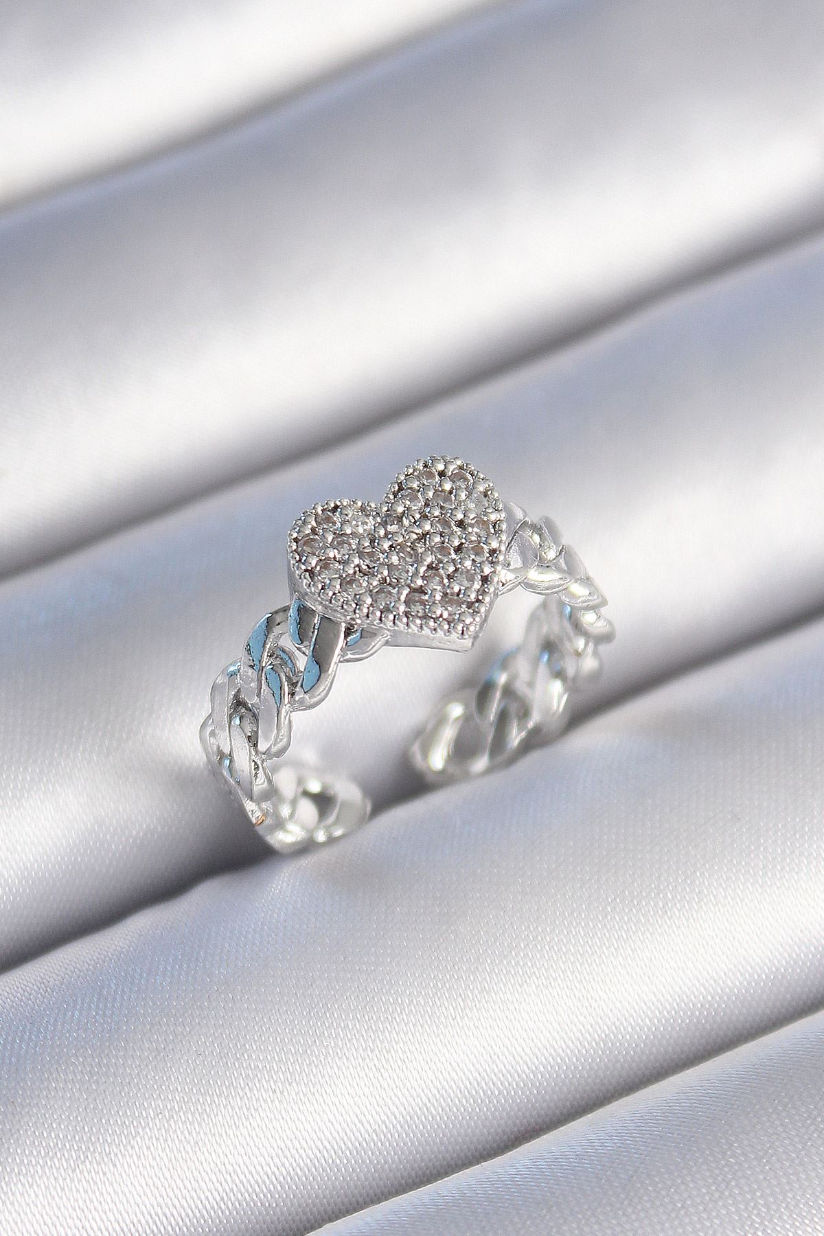 Pirinç Gümüş Renk Zincir Kordon Zirkon Taşlı Kalp Model Kadın Yüzük - TJ-BYK3484