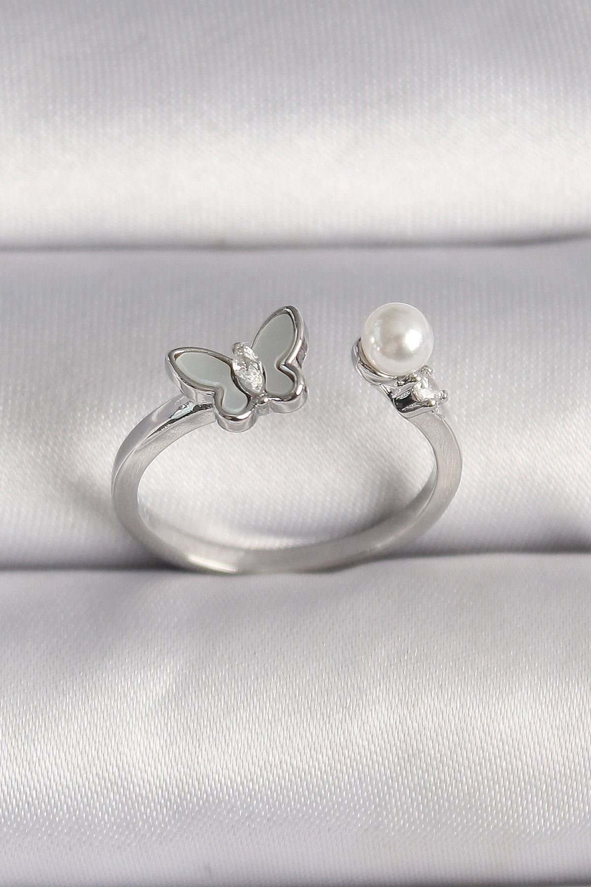 Pirinç Gümüş Renk Zirkon Taş Detaylı Beyaz Mineli Kelebek Figür İnci Detay Ayarlanabilir Yüzük - TJ-BYK3524
