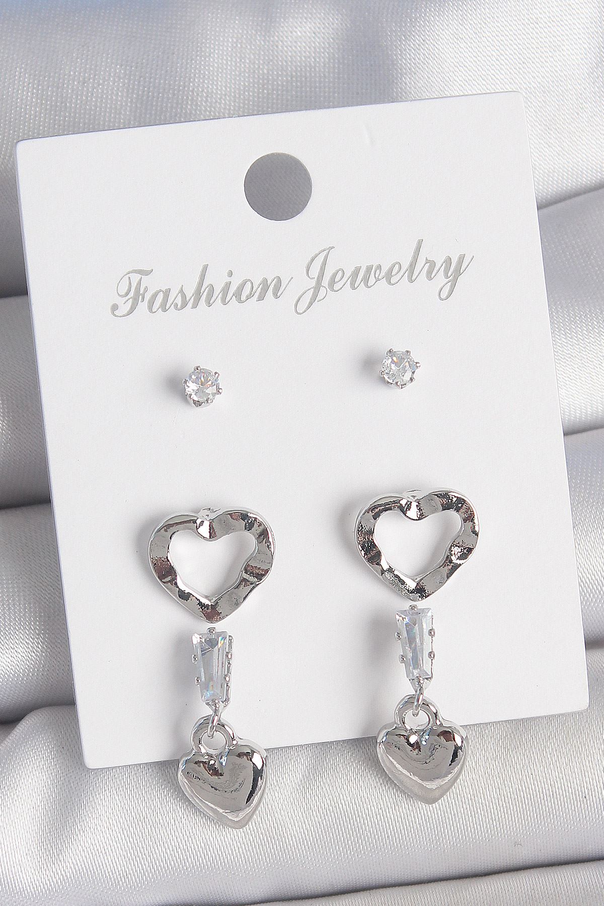 Pirinç Gümüş Renk Zirkon Taşlı Sallantılı Kalp Model Yarım Halka Detay 3 Çfit Kadın Küpe Seti - TJ-BKP10594