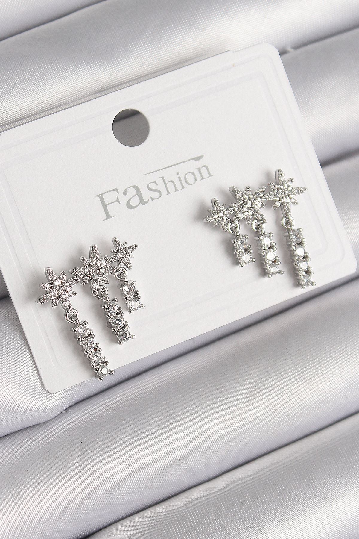 Pirinç Gümüş Renk Zirkon Taşlı 3'Lü Sallantı Yıldız Model Kadın Küpe - TJ-BKP9757