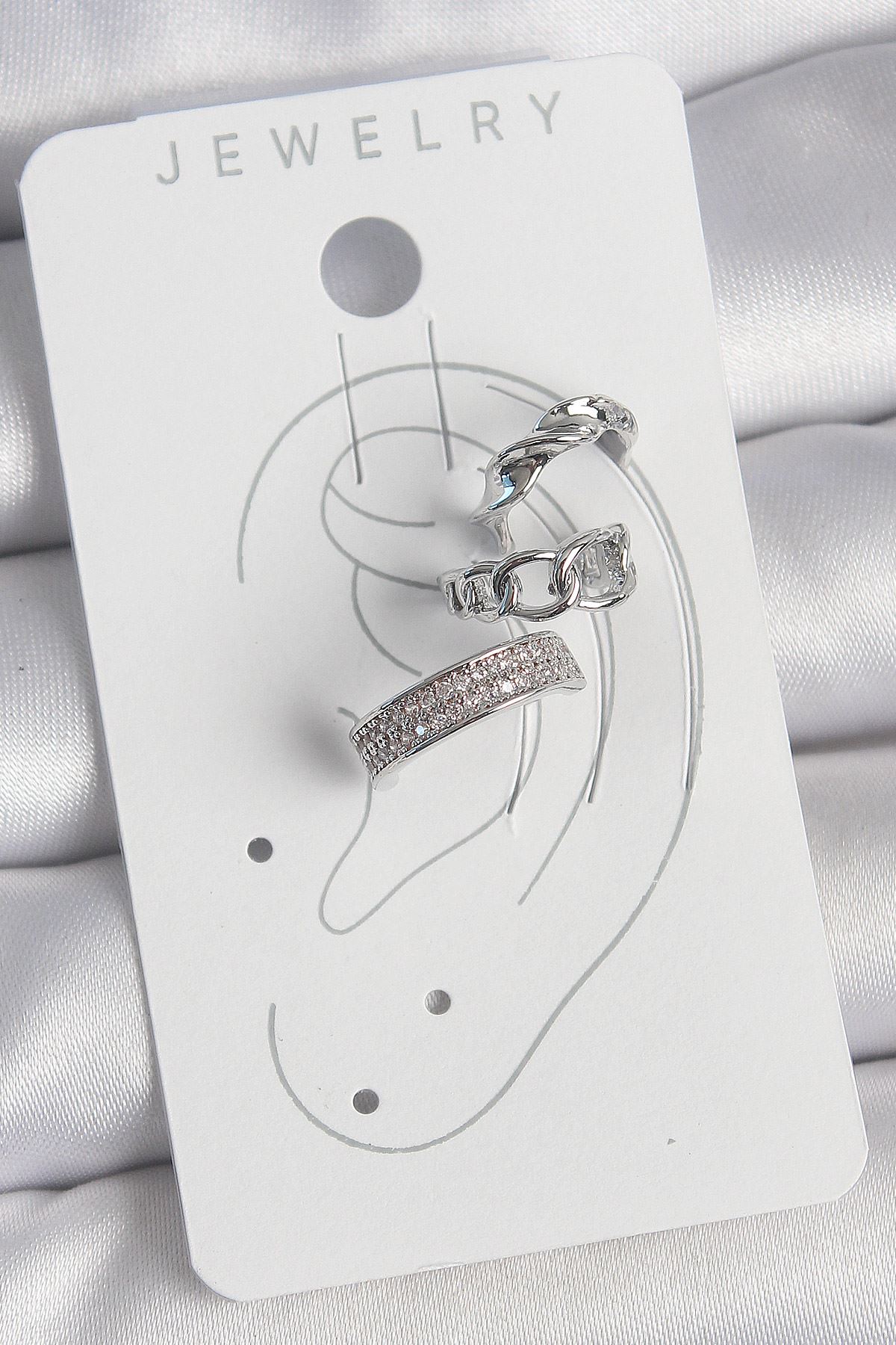 Pirinç Gümüş Renk Zirkon Taşlı 3'Lü Zincir Sarmal Model Kadın Kıkırdak Küpe - TJ-BKP10565