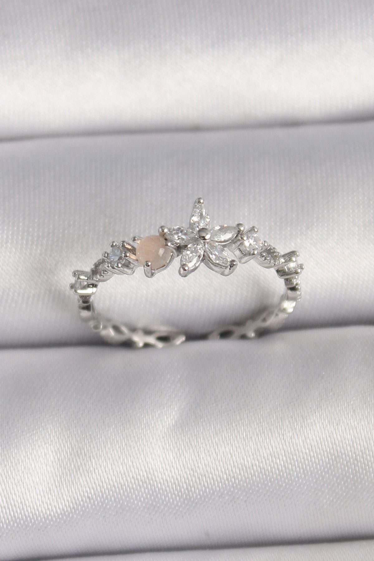 Pirinç Gümüş Renk Zirkon Taşlı Çiçek Model Ayarlanabilir Yüzük - TJ-BYK3564