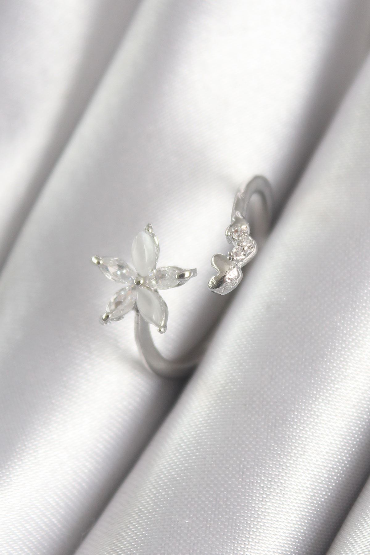 Pirinç Gümüş Renk Zirkon Taşlı Çiçek Model Kalp Detay Kadın Yüzük - TJ-BYK3070