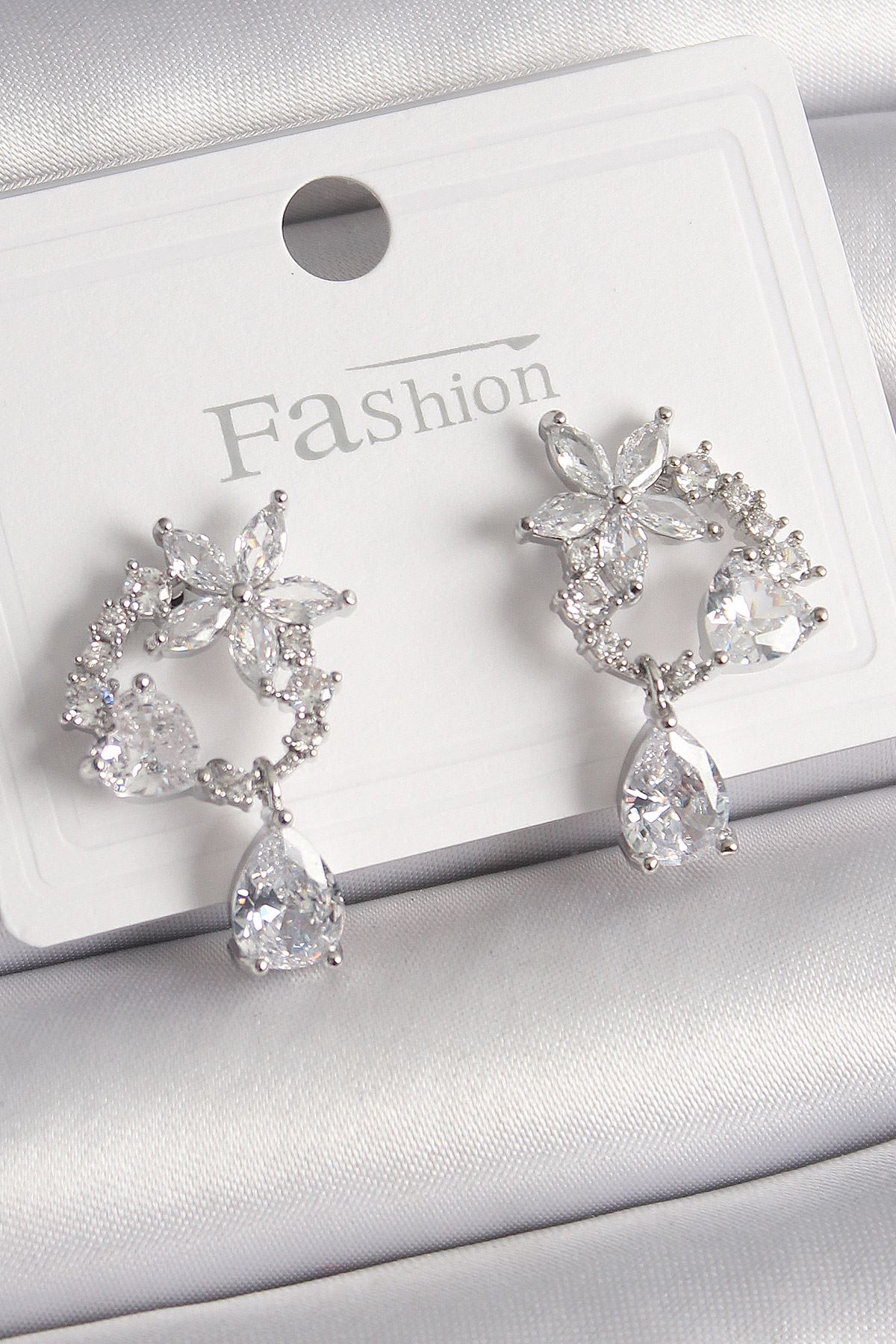 Pirinç Gümüş Renk Zirkon Taşlı Çiçek Model Sallantı Damla Detay Kadın Küpe - TJ-BKP9912