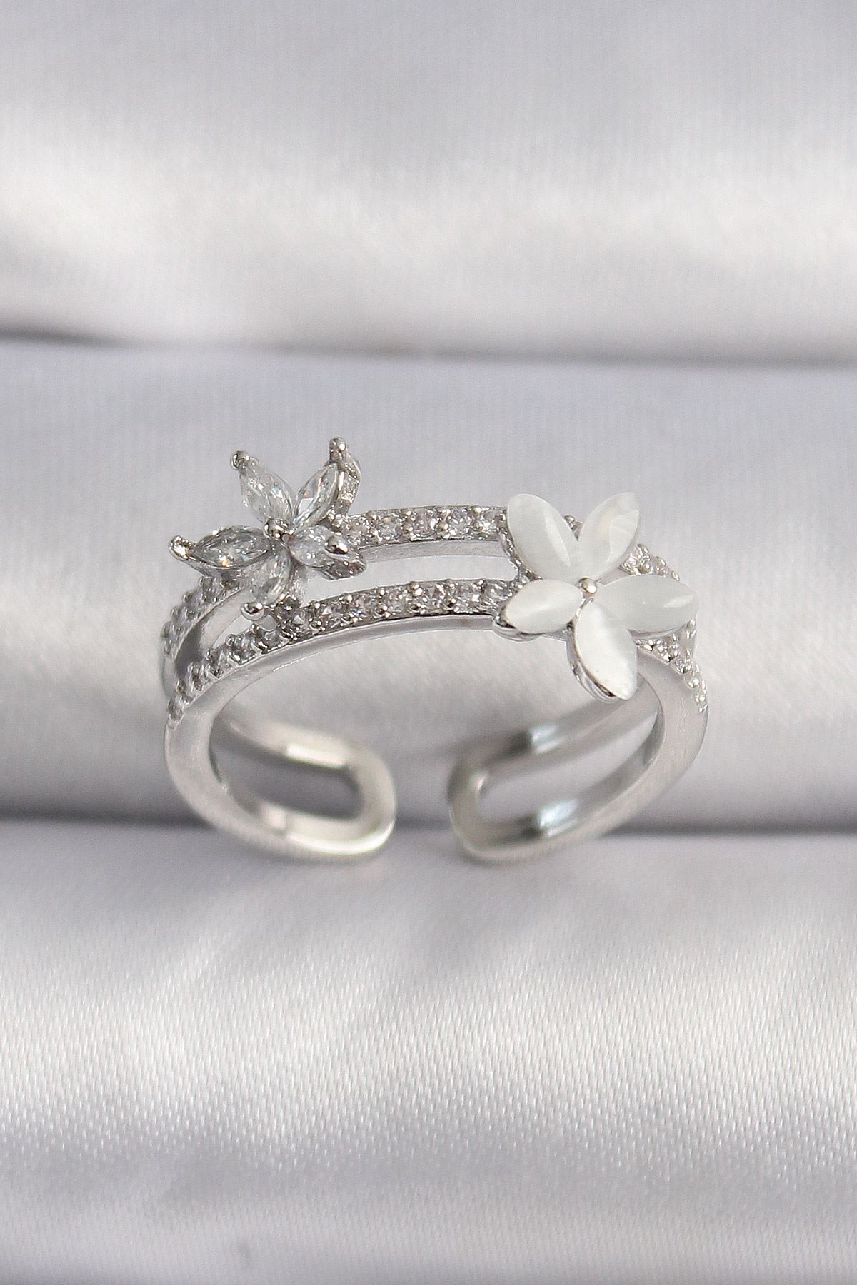 Pirinç Gümüş Renk Zirkon Taşlı Çiçek Model VIP Seri Kadın Yüzük - TJ-BYK3513