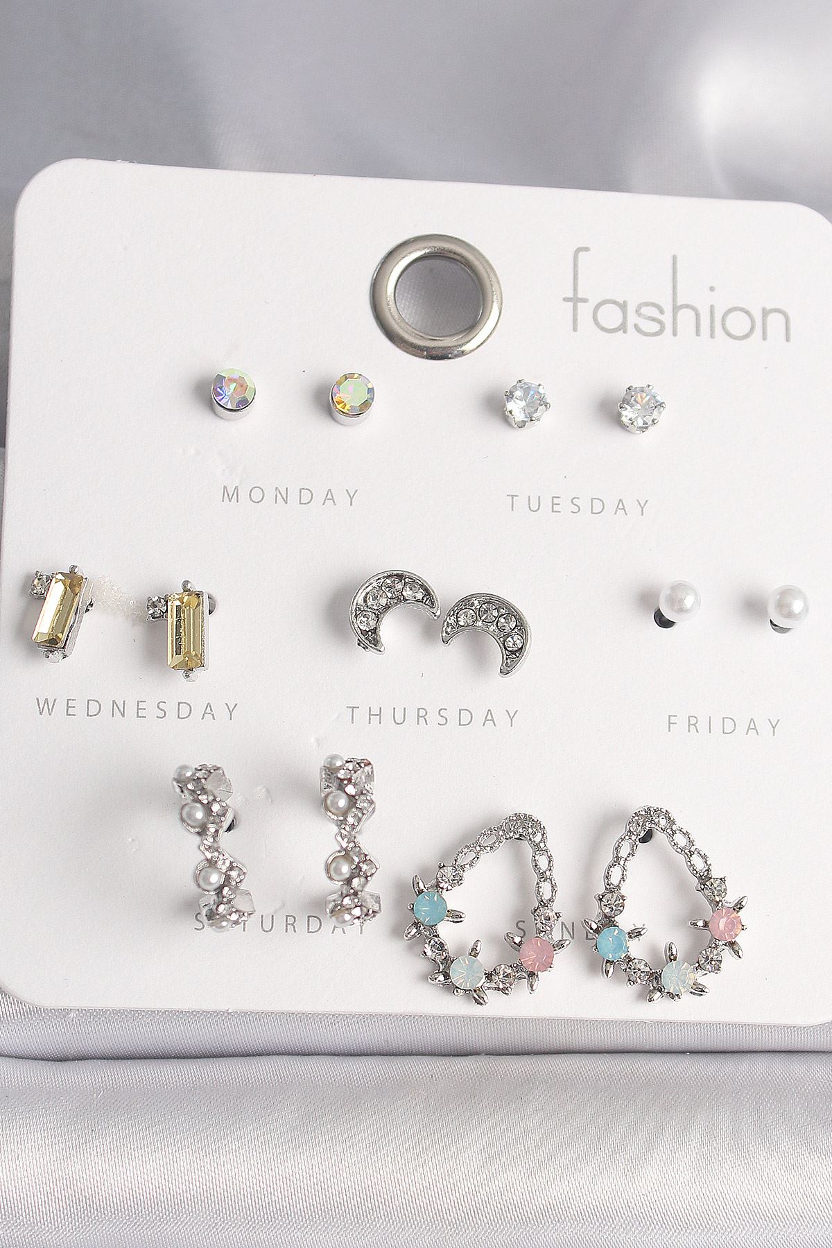 Pirinç Gümüş Renk Zirkon Taşlı Damla Model Hilal Detay 7 Çift Kadın Küpe Seti - TJ-BKP10137