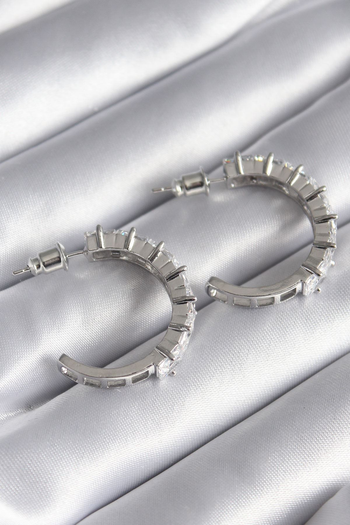 Pirinç Gümüş Renk Zirkon Taşlı Halka Model Kadın Küpe - TJ-BKP8610