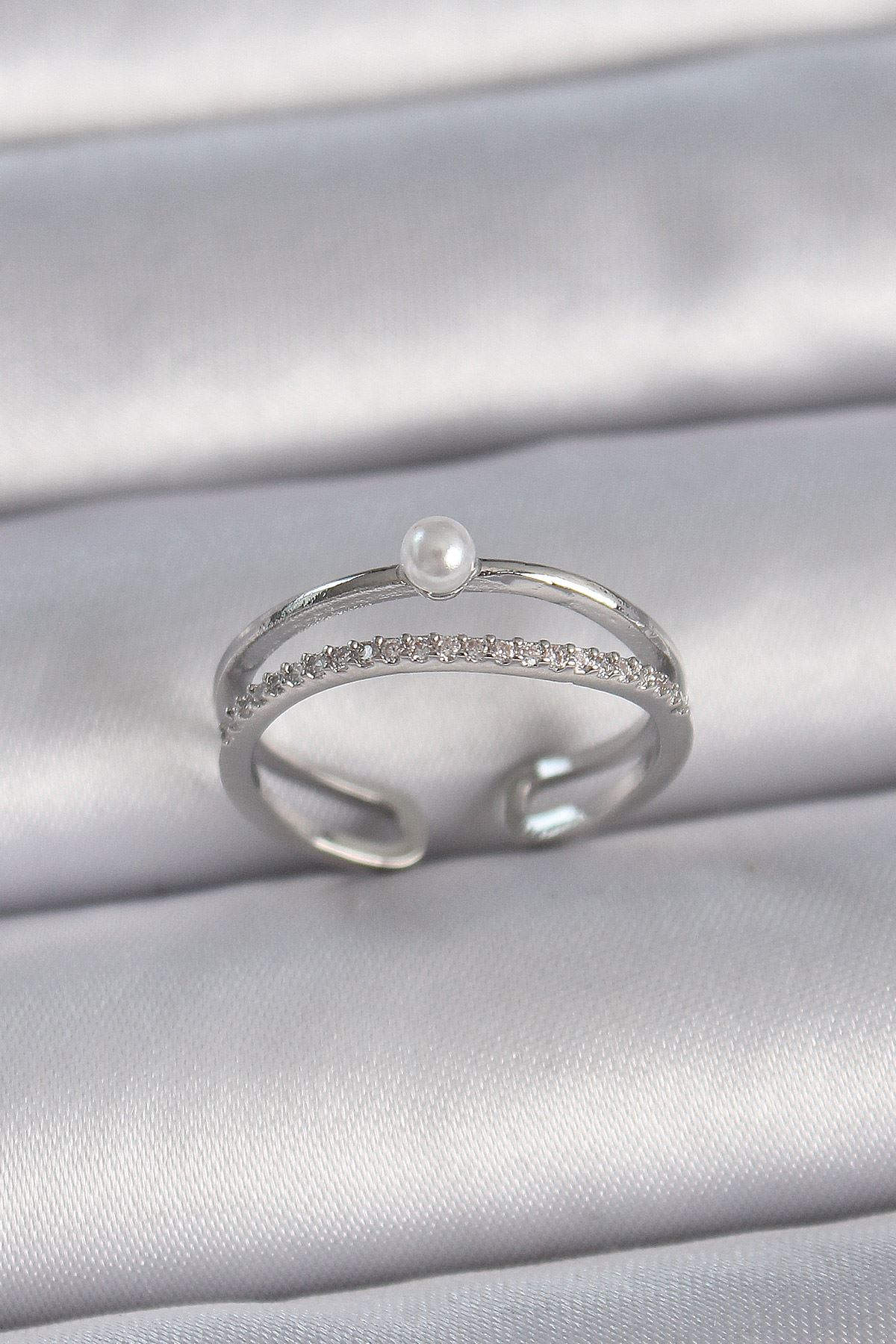 Pirinç Gümüş Renk Zirkon Taşlı İnci Detay Ayarlanabilir Model Kadın Yüzük - TJ-BYK3371