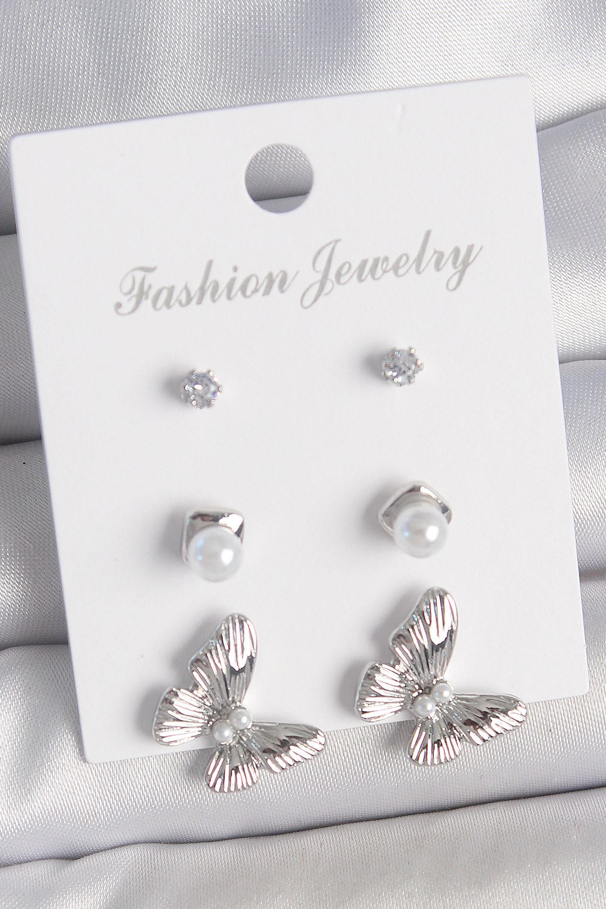 Pirinç Gümüş Renk Zirkon Taşlı İnci Detaylı Kelebek Model 3 Çift Kadın Küpe Seti - TJ-BKP10602