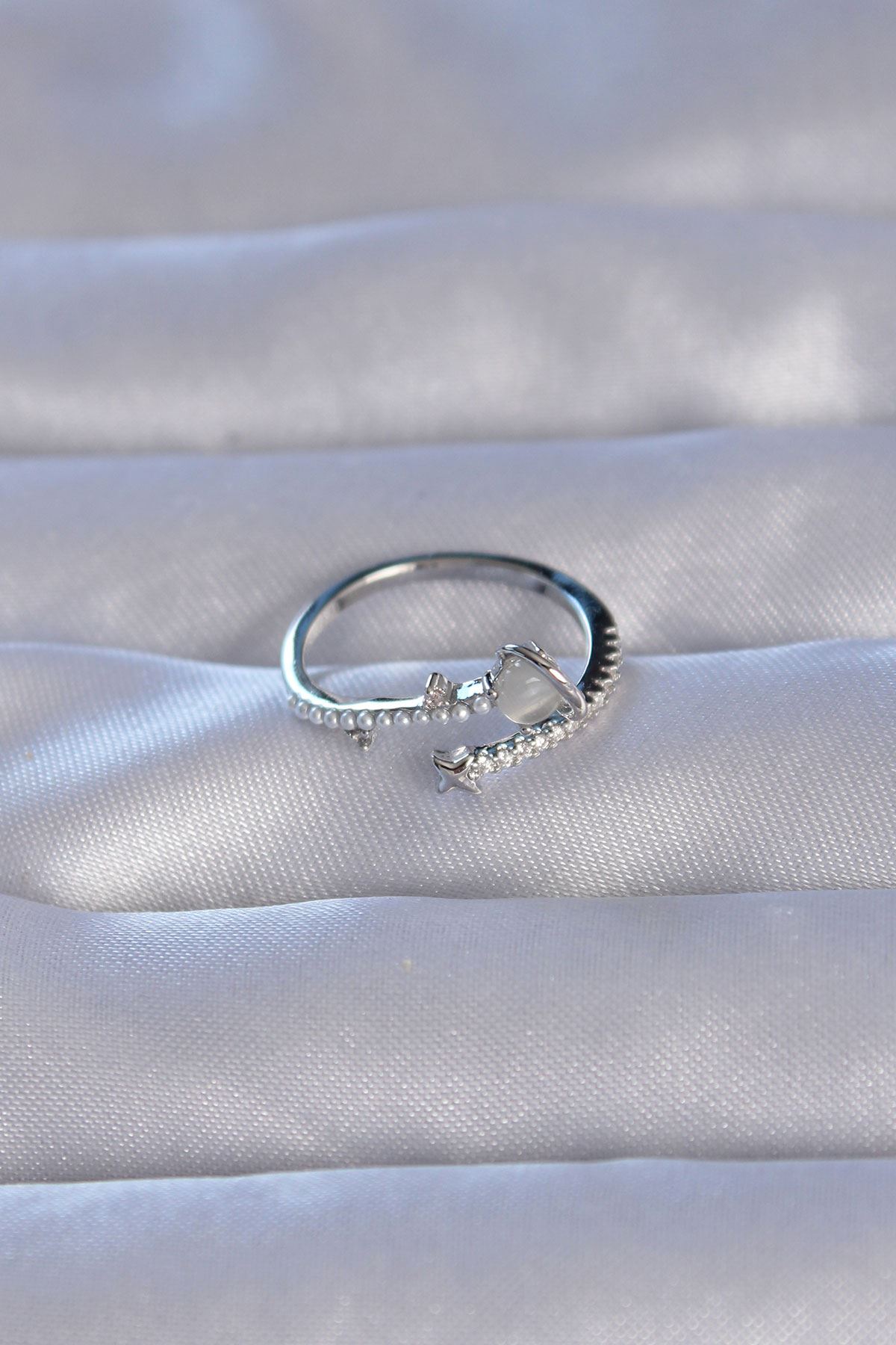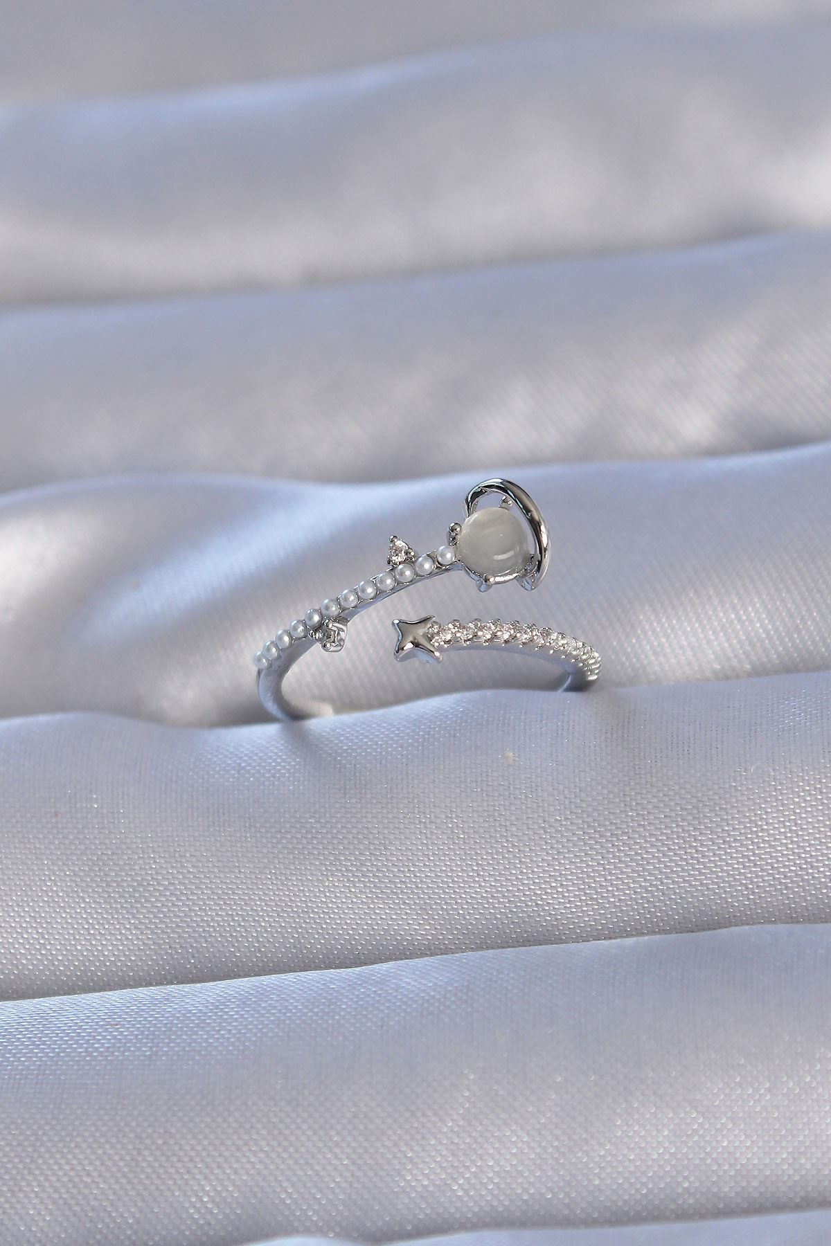 Pirinç Gümüş Renk Zirkon Taşlı İncili Satürn Model Ayarlanabilir Yüzük - TJ-BYK3222