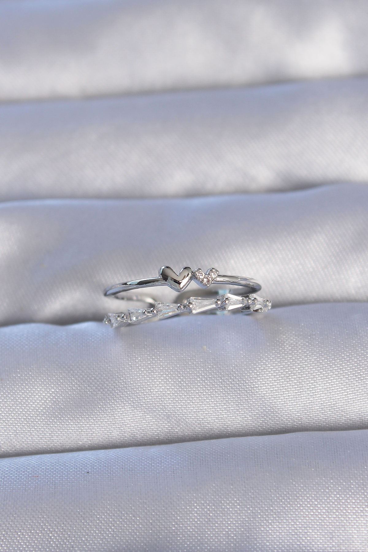 Pirinç Gümüş Renk Zirkon Taşlı Kalpli 2li Görünüm Ayarlanabilir Yüzük - TJ-BYK3210