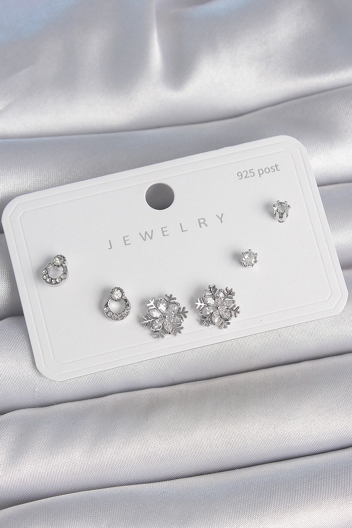 Pirinç Gümüş Renk Zirkon Taşlı Kar Tanesi Model 925 Ayar Gümüş Çivi Kadın Küpe Seti - TJ-BKP10483