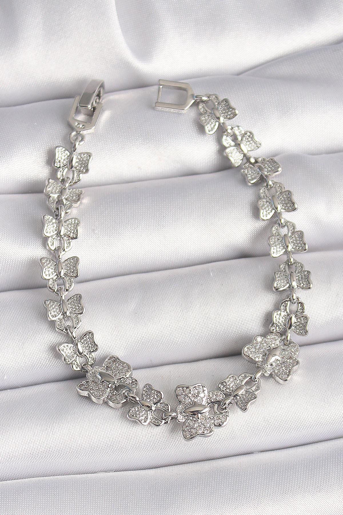 Pirinç Gümüş Renk Zirkon Taşlı Kelebek Model Zincir Kadın Bileklik - TJ-BB6835