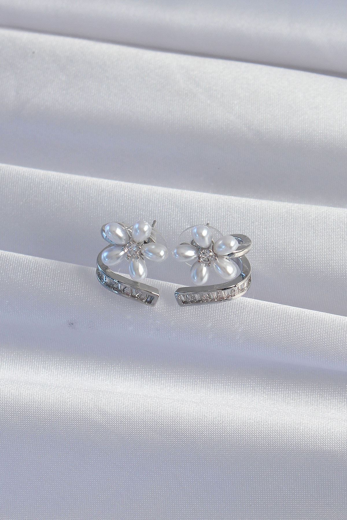 Pirinç Gümüş Renk Zirkon Taşlı Kıvrımlı İnci Çiçek Küpe - TJ-BKP9276