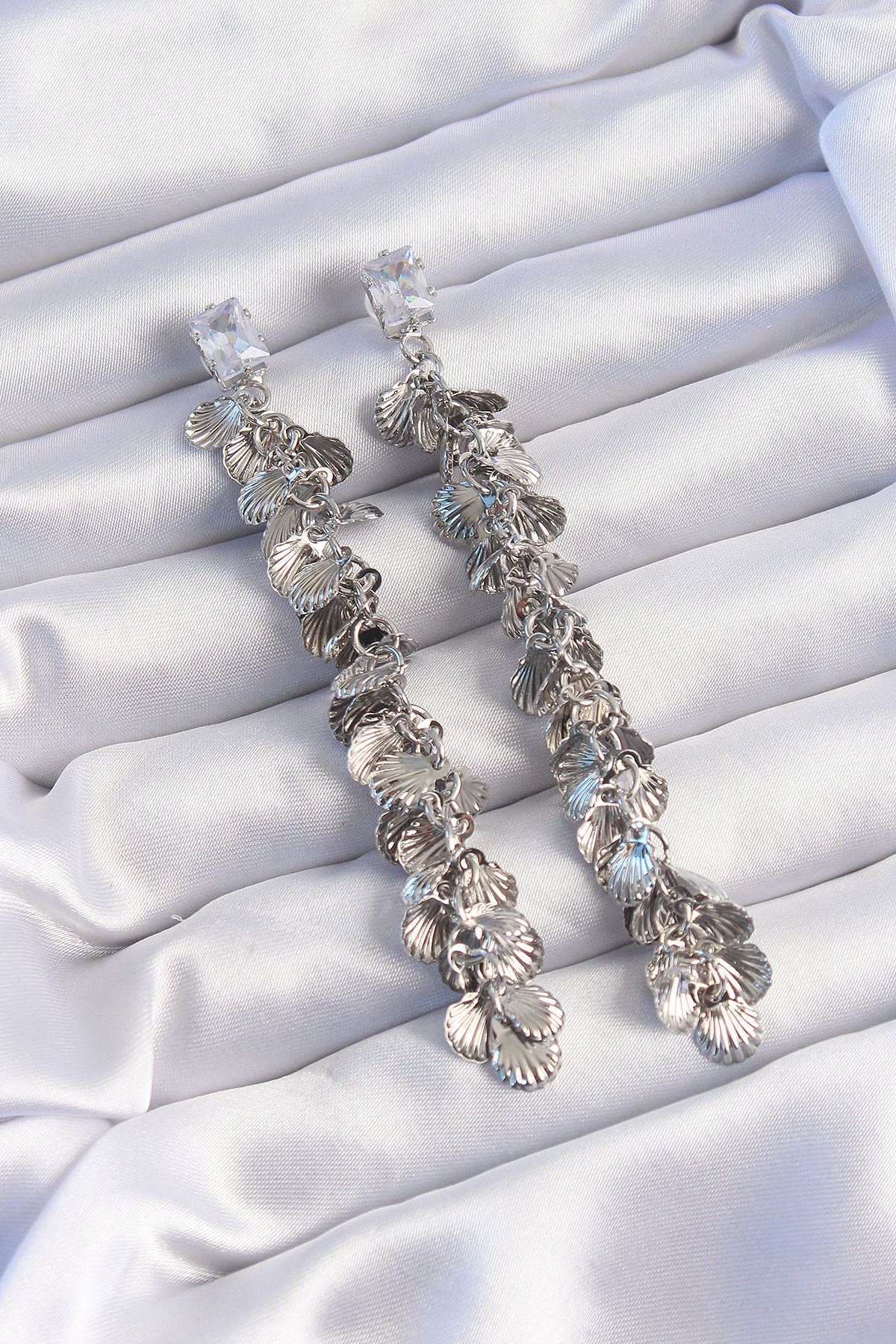 Pirinç Gümüş Renk Zirkon Taşlı Minimal Deniz Kabuklu Sallantılı Küpe - TJ-BKP9253