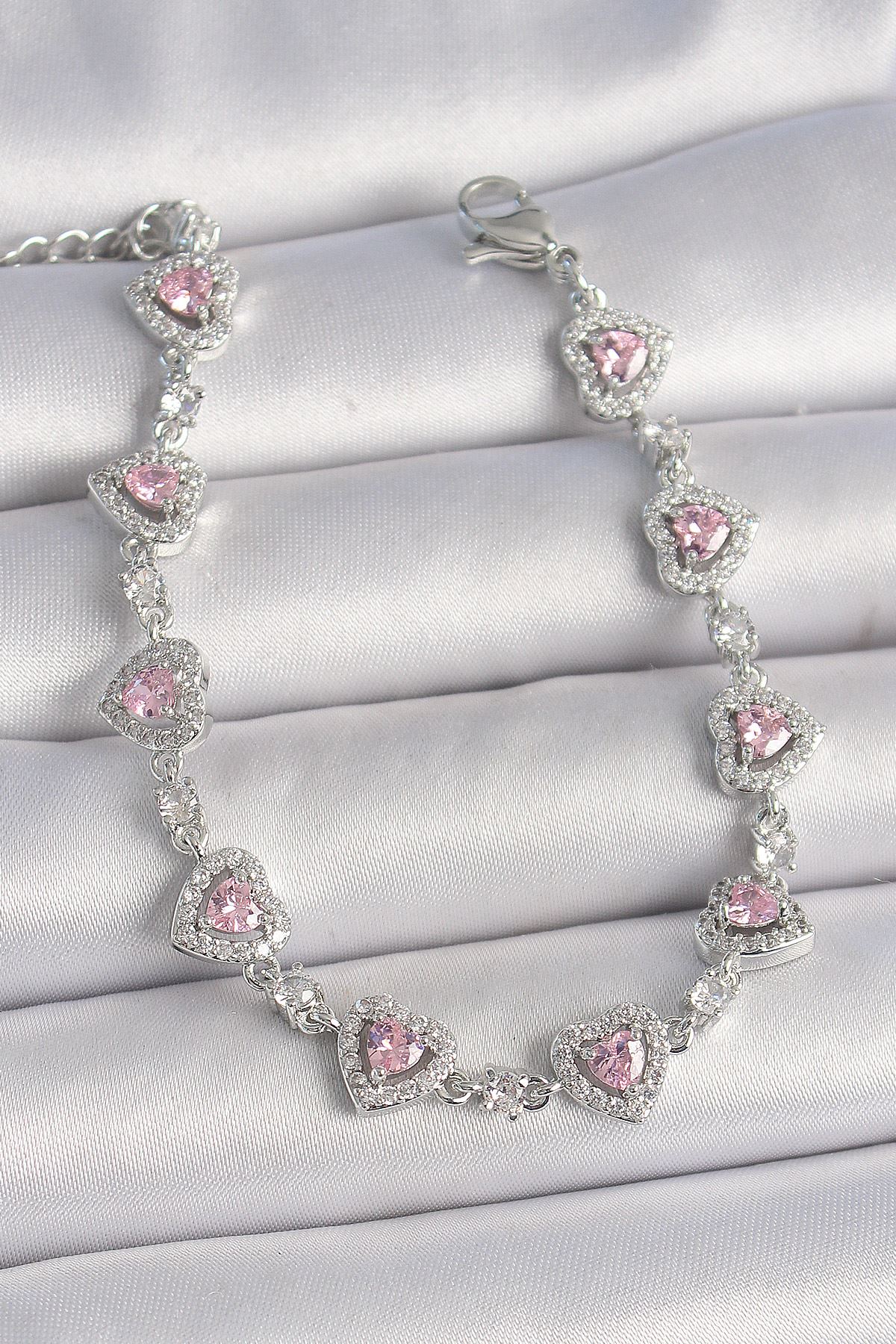 Pirinç Gümüş Renk Zirkon Taşlı Pembe Kalp Model VIP Seri Kadın Bileklik - TJ-BB6914