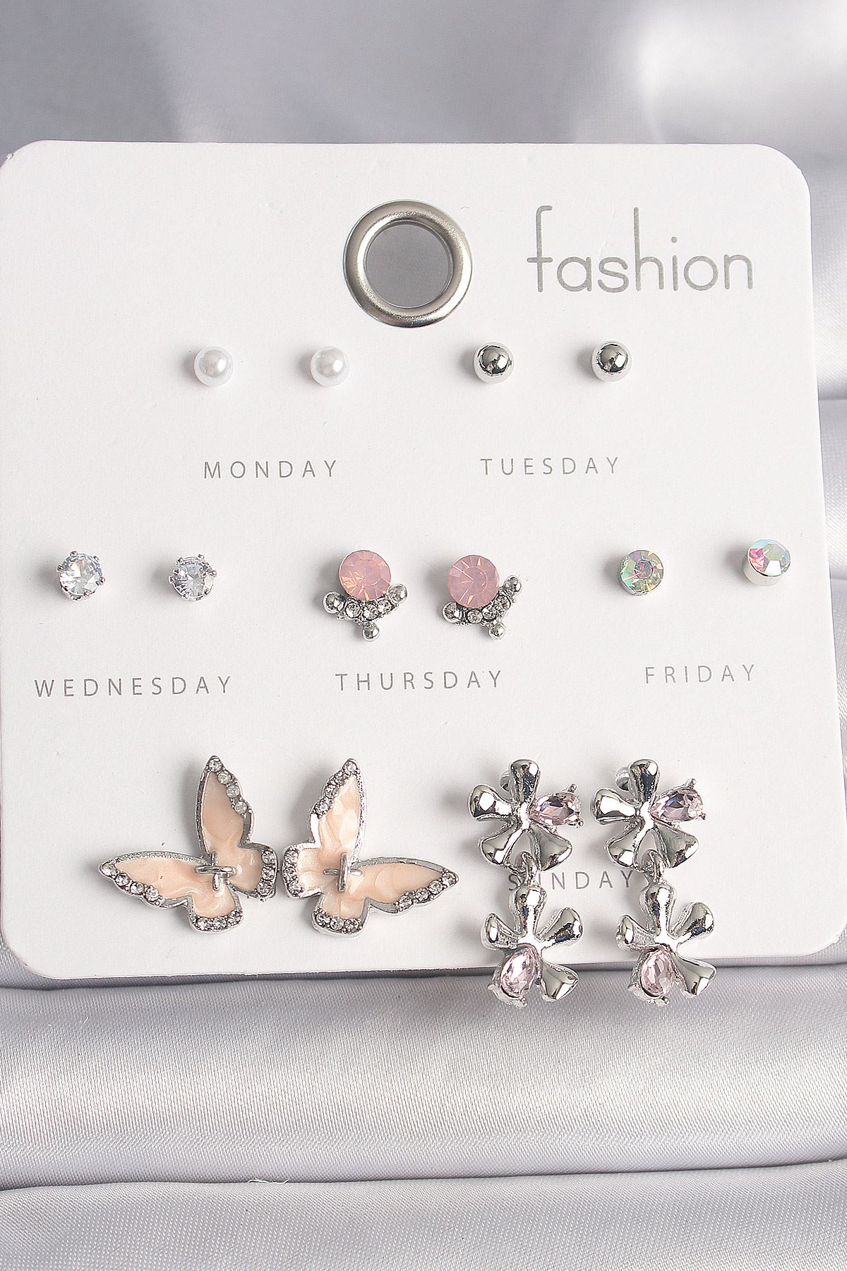 Pirinç Gümüş Renk Zirkon Taşlı Sallantı Çiçek Mineli Kelebek Figür İnci Detay 7 Çift Kadın Küpe Seti - TJ-BKP10138
