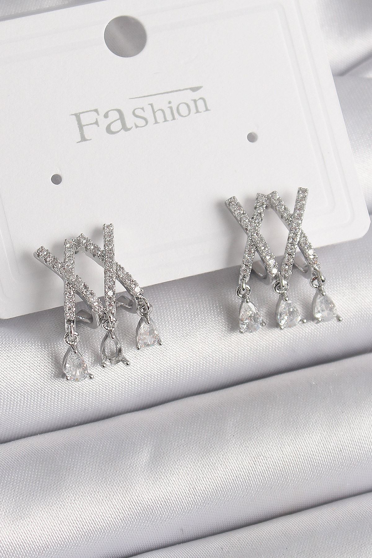 Pirinç Gümüş Renk Zirkon Taşlı X Model Sallantı Detay Kadın Küpe - TJ-BKP9873