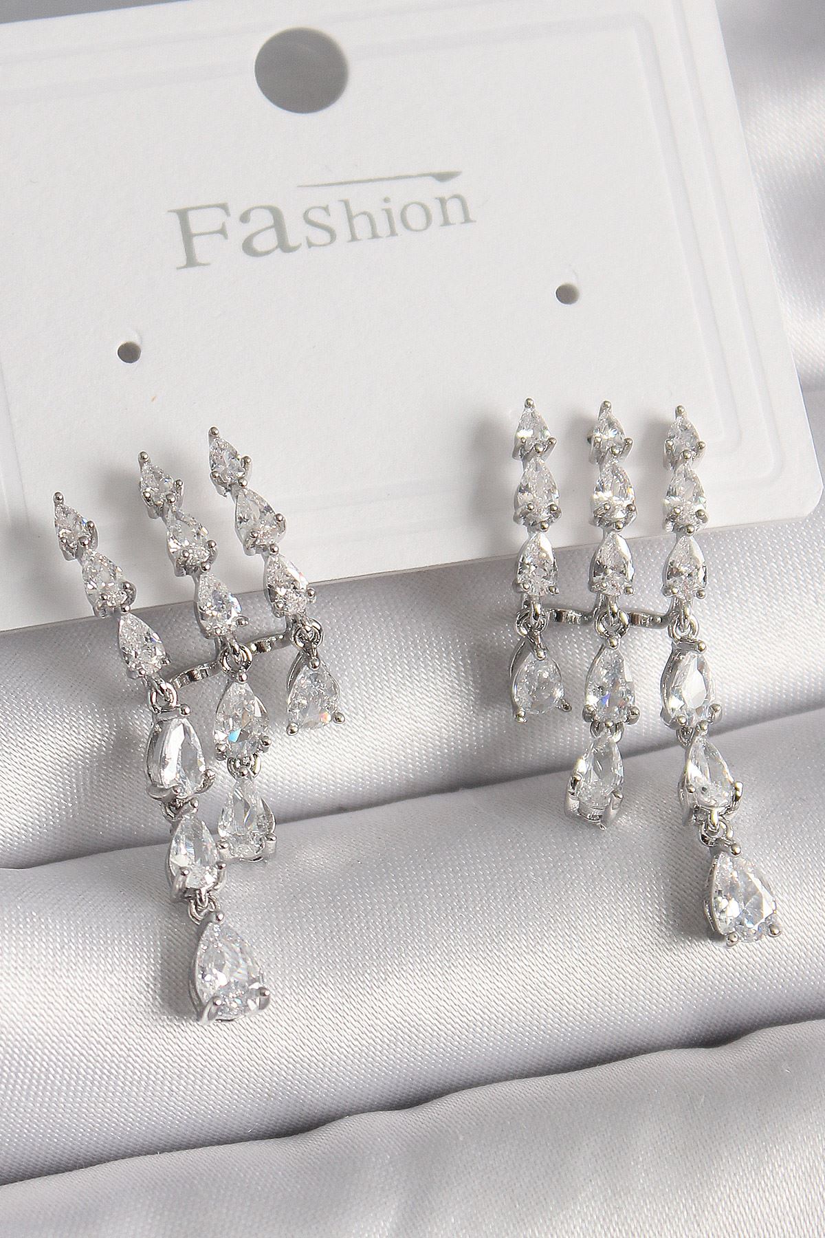 Pirinç Gümüş Renk Zirkon Taşlı Yağmur Model Kadın Küpe - TJ-BKP9936