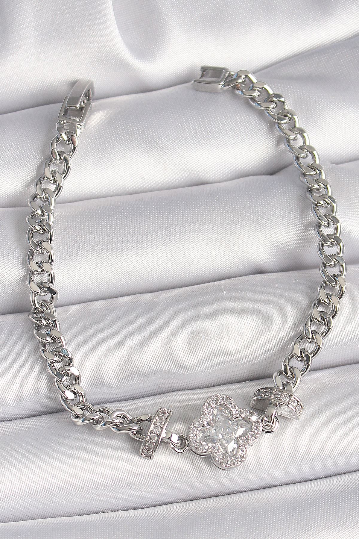 Pirinç Gümüş Renk Zirkon Taşlı Yonca Figür Zincir Model Kadın Bileklik - TJ-BB6819
