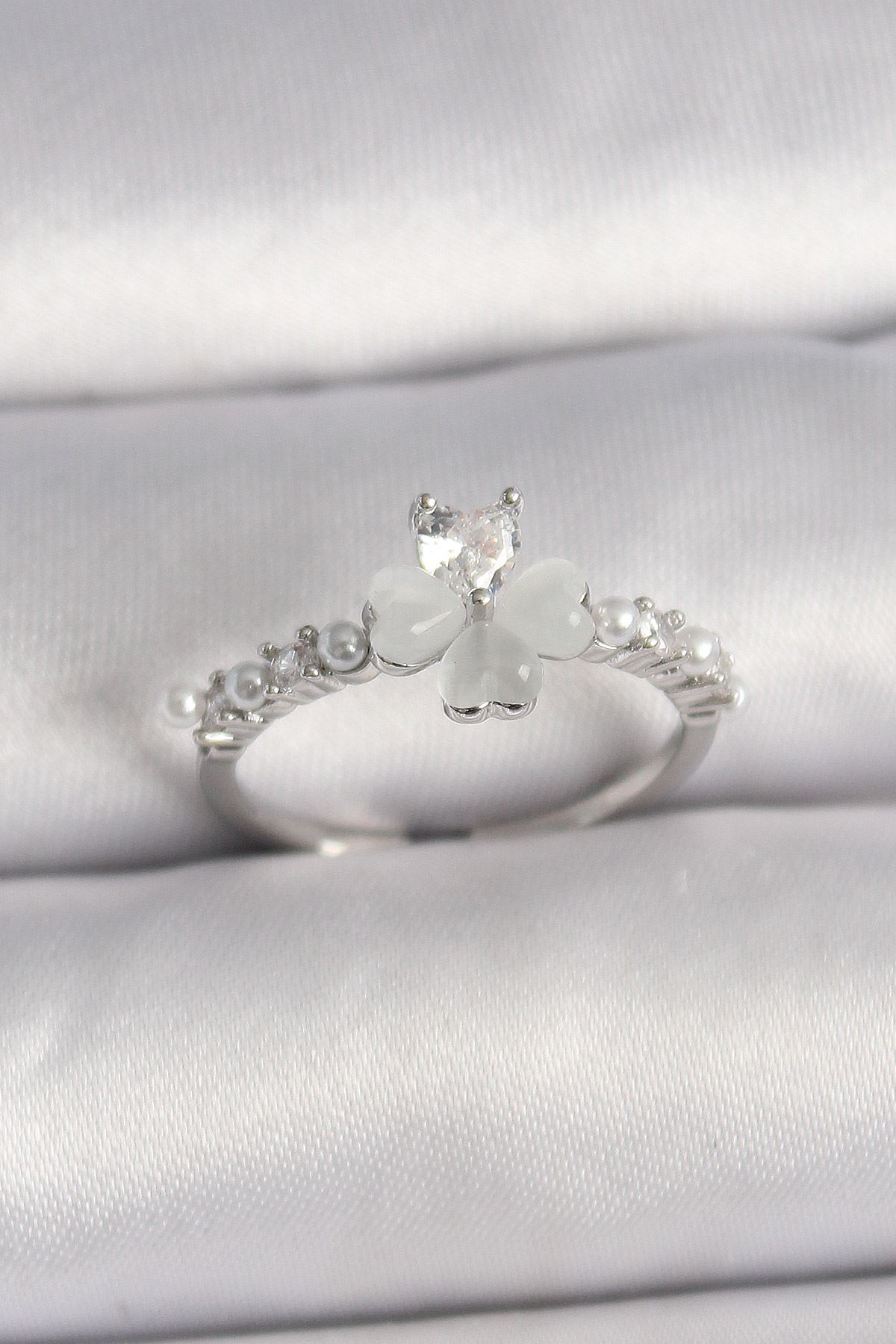 Pirinç Gümüş Renk Zirkon Taşlı Yonca Model İnci Detay Ayarlanabilir Yüzük - TJ-BYK3552